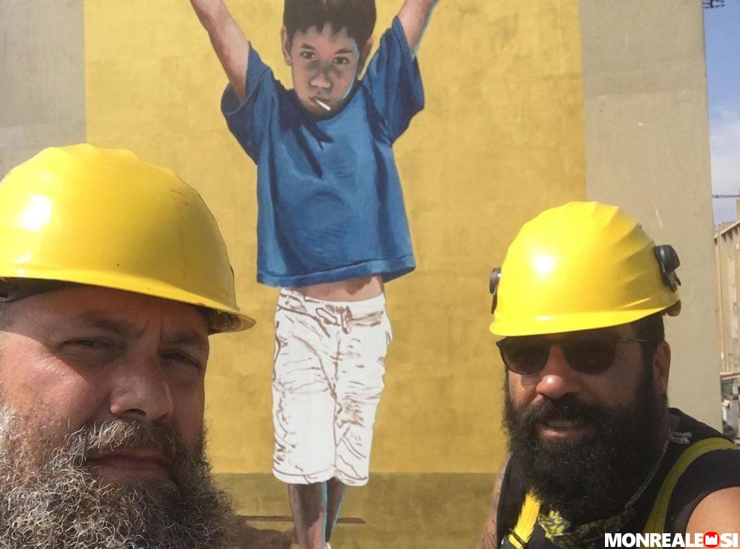 Il murale è un bambino con le braccia alzate, le palme delle mani in su, i piedi incrociati. Ma lo sguardo non è sconfitto, anzi sembra sfidarti, perché lui, la croce che si allunga come un’ombra sullo sfondo, la vorrebbe tenere alle spalle. Un’opera che l’artista dedica a tutti i bambini e le bambine. “Perché sono la nostra unica possibilità – dice Palminteri -, per costruire insieme una visione nuova, una Palermo possibile che riesca a guardare alla bellezza e al futuro”.