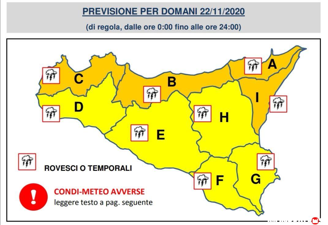 Intanto il dipartimento di Protezione civile regionale ha diramato una allerta meteo arancione, domani 22 novembre. Previste precipitazioni “da sparse a diffuse, anche a carattere di rovescio o temporale, sulla Sicilia occidentale ed orientale, con quantitativi cumulati moderati, fino a puntualmente elevati.