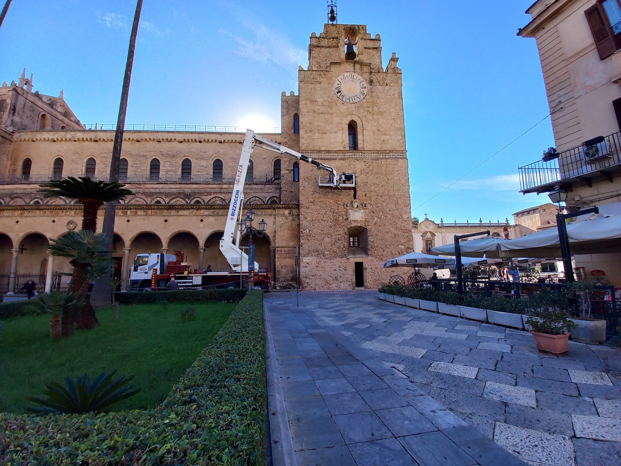 Finalmente l’orologio che domina piazza Vittorio Emanuele torna a ricordare l’ora ai monrealesi. Stamattina la ditta incaricata dal Duomo ha avviato le operazioni di restauro dei numeri romani che segnano l’ora. I numeri dunque saranno più visibili. Poi sarà installata la lancetta che segna le ore e i minuti sul grande orologio della torre che si trova tra piazza Vittorio Emanuele e piazza Guglielmo II.