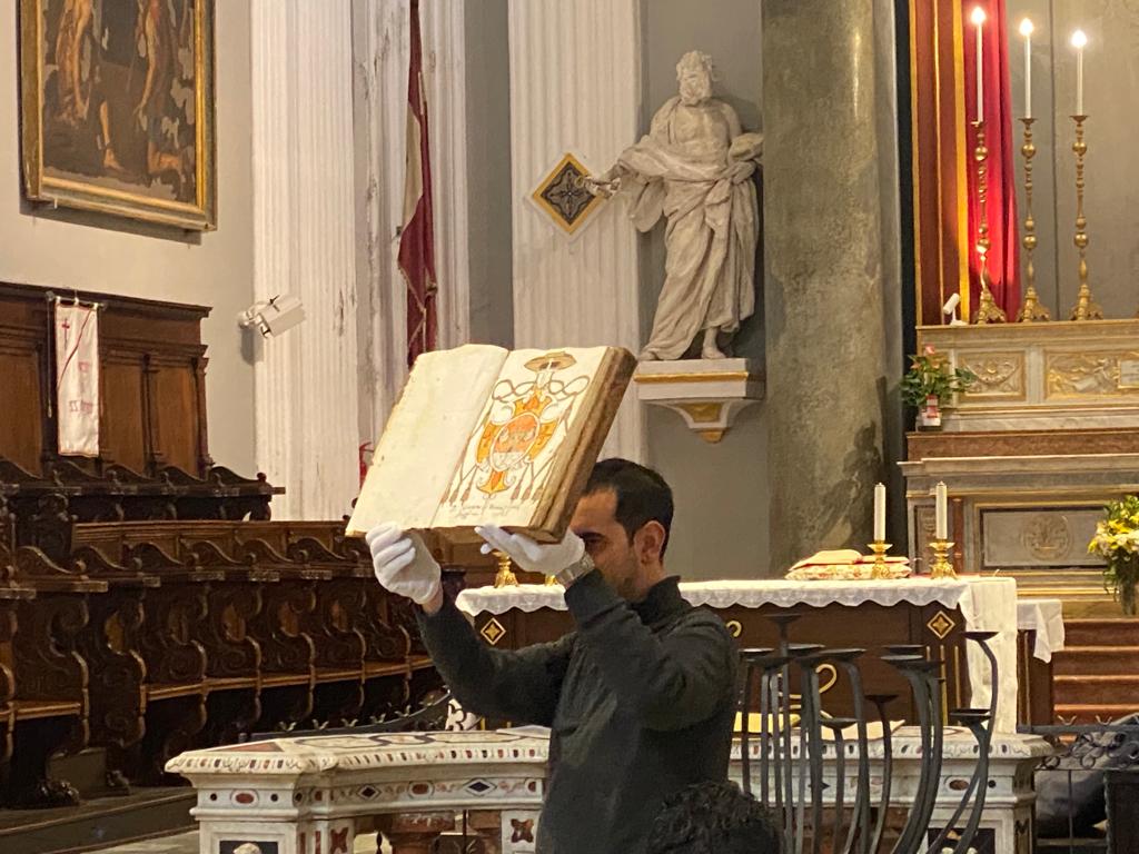 Anche se era una conferenza per bambini don Giovanni ha portato alcuni antichi documenti, mostrando quanto fossero importanti per ricostruire la storia: i bambini sono stati invitati a osservare quanto accadeva nel maggio 1575, quando in un registro notarile venivano elencati gli arredi più preziosi dell’antica chiesa che sorgeva nello stesso luogo dove poi sarebbe stata edificata la Collegiata. Fra quegli arredi c’era un grande crocifisso di autore sconosciuto, appeso al muro. Quindi, messe di lato le leggende, il Crocifisso era a Monreale diverse decenni prima dell’arrivo dell’arcivescovo Girolamo Venero, che però istituisce la festa.