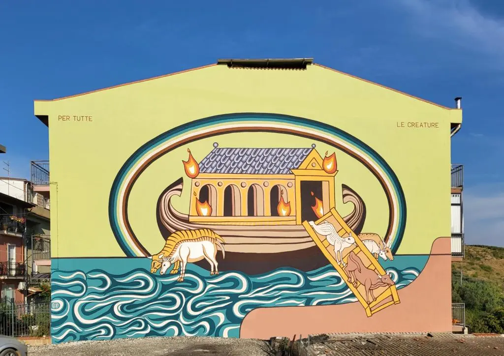 Il trittico riflette l’interazione tra il locale e il globale. “Il fuoco che brucia l’arca rappresenta la distruzione della Comunità, della casa, di tutto ciò che è protezione,” spiega Palminteri, facendo riferimento alle case e ai luoghi di memoria andati in fumo l’estate scorsa. “Gli animali scappano da quell’arca. E poi c’è l’acqua: è una riflessione sulla natura, sulla Madre Terra. Sugli incendi, certamente, ma anche sullo scioglimento dei ghiacciai e i problemi climatici che affliggono il nostro pianeta.”
