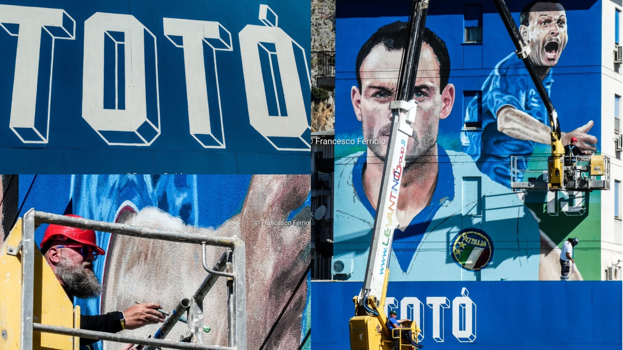 Inaugurato al CEP di Palermo il murale in ricordo di Totò Schillaci, l’iconico bomber di Italia ’90 è stato raffigurato nel quartiere in cui è cresciuto su una parete di un palazzo di proprietà dello IACP. L’opera di 15m x 15m immortala l’eroe delle notti magiche di Italia ’90 nella sua storica esultanza a braccia aperte in una corsa liberatoria. A dar vita al murale che ritrae l’ex centravanti è stato Igor Scalisi Palminteri, con l’aiuto del pioppese Nino Carlotta. I due hanno realizzato importanti opere in tutta la Sicilia e ora hanno riportato il volto inconfondibile del numero 19 della Nazionale a risplendere tra le case di una delle tante periferie dimenticate della città. Il murale intitolato “Totò” raffigura il bomber palermitano nell’indimenticabile corsa a braccia aperte che ha unito non solo un quartiere e tutta la città, ma un intero Paese. L’opera, finanziata dalla Fondazione Federico II in collaborazione con il Palermo FC, è stata presentata ieri sera alla presenza degli artisti, della famiglia di Schillaci, del presidente della Fondazione Federico II on. Gaetano Galvagno, e del presidente del Palermo FC Dario Mirri.