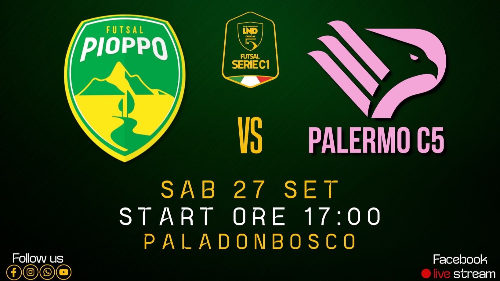 Sabato pomeriggio al Pala Don Bosco di Palermo i gialloverdi del Pioppo Futsal riceveranno i rosanero del Palermo C5 in occasione della terza giornata del Campionato di Serie C1, il primo confronto con una società che punta al vertice della classifica del Campionato di Serie C1. Un match contro una rosa ben attrezzata, che servirà ai gialloverdi per confrontarsi contro una squadra che ormai da diversi anni punta al titolo in Serie C1 e di conseguenza sarà uno stimolo maggiore per gli uomini di mister Basile che scenderanno in campo. Il Palermo C5 dal canto suo vorrà continuare a mantenere il punteggio pieno, mentre il Pioppo Futsal è alla ricerca di punti fondamentali nel primo anno di Serie C1 e dopo i due pareggi consecutivi delle due giornate di Campionato. Appuntamento domani pomeriggio presso il Pala Don Bosco di Palermo, sito in Via S. Domenico Savio, 4 – Palermo PA, con calcio d’inizio previsto per le ore 17:00. Sarà possibile seguire il match in live streaming sulla pagina Facebook del Pioppo Futsal.
