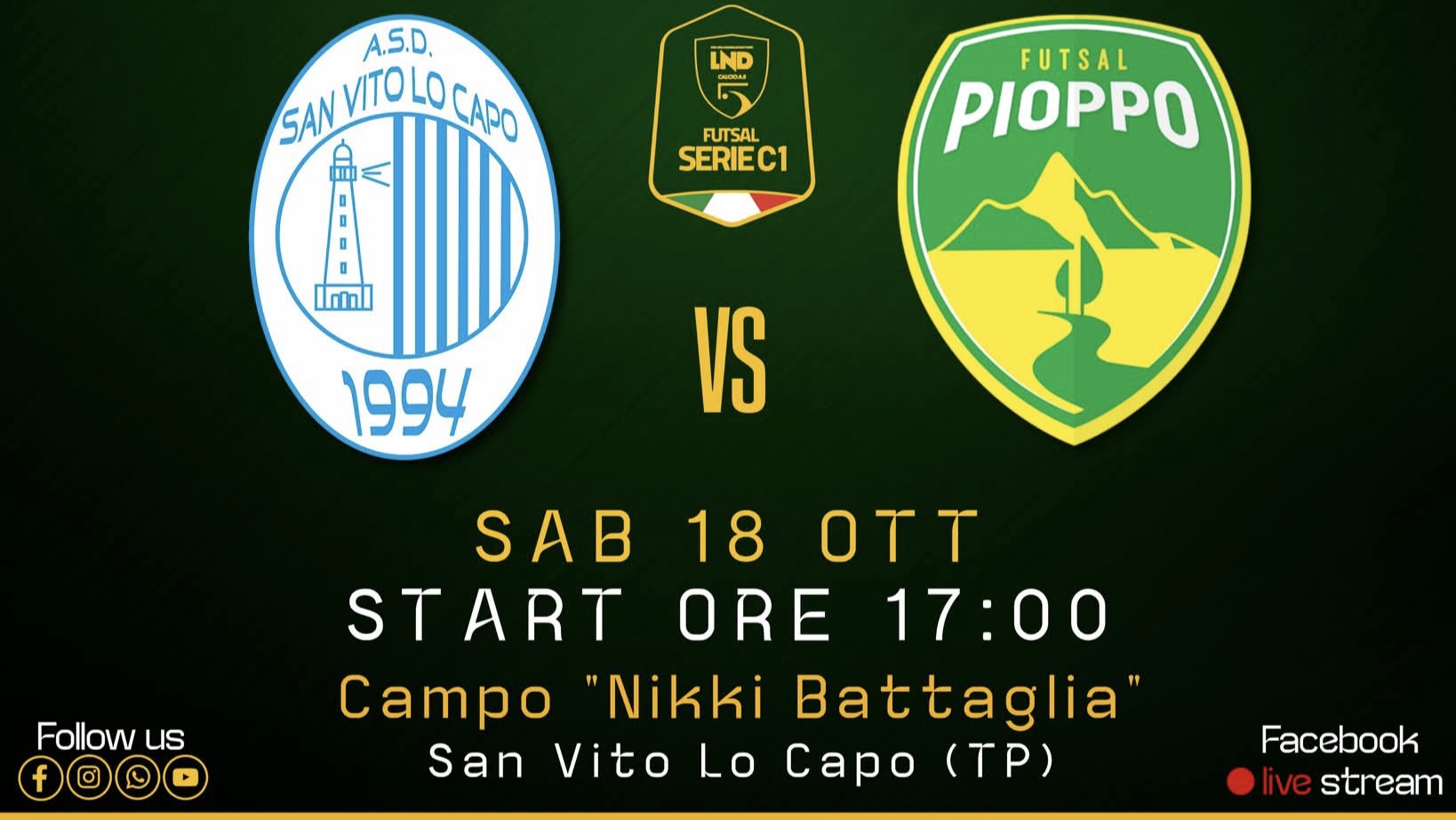 Sabato pomeriggio presso il Campo Nikki Battaglia i gialloverdi del Pioppo Futsal scenderanno in campo in occasione della sesta giornata del Campionato di Serie C1 contro i biancoazzurri del San Vito Lo Capo 1994. Una trasferta che nasconde insidie per la squadra pioppese, ancora senza bottino pieno nelle cinque partite precedenti e con i locali alla ricerca dei primi punti stagionali; difatti i gialloverdi hanno maturato 4 pareggi e 1 sconfitta, mentre i biancoazzurri si trovano in ultima posizione con 0 punti in compagnia dello Sport Club Giudecca. Un match che vedrà le due squadre pronte a dare il massimo per portare a casa tutta la posta in palio e muovere la classifica. Per mister Basile si tratta del primo incontro contro la sua ex squadra, l’allenatore adesso sulla panchina gialloverde ha guidato i biancoazzurri per 5 stagioni consecutive. In questi anni a San Vito Lo Capo C5, nel massimo campionato regionale di Serie C1, ha raggiunto una finale playoff per la Serie B al primo anno e ottenendo sempre gli obbiettivi richiesti dalla società con il valore aggiunto di idee chiare e gioco concreto. Appuntamento presso il Campo Nikki Battaglia di San Vito Lo Capo, sito in , con calcio d’inizio per le ore 17:00.
