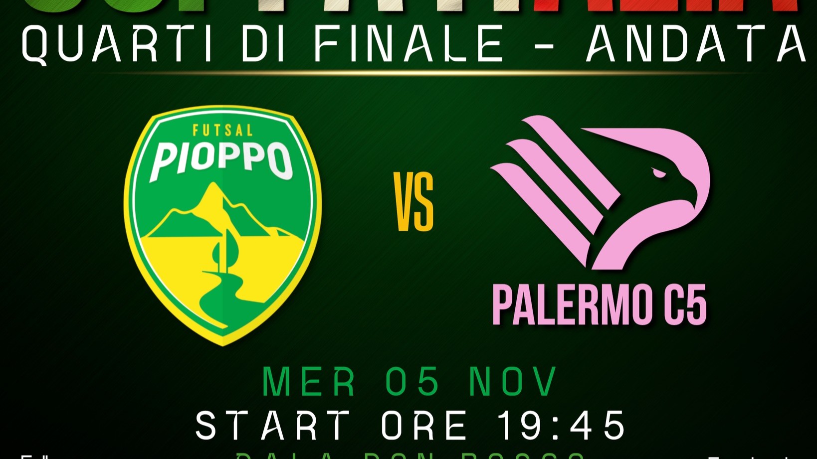 Questa sera al Pala Don Bosco di Palermo andrà in scena il match d’andata dei quarti di Coppa Italia tra Pioppo Futsal e Palermo C5, un match che mette nuovamente a confronto la neopromossa ed una veterana del Campionato di Serie C1. In campionato le due squadre hanno regalato un pomeriggio di bel futsal, con i gialloverdi in piena partita fino allo scadere del match; difatti il Pioppo Futsal aveva maturato un ottimo pareggio a 4 minuti dalla sirena per poi finire 6-4 in favore dei rosanero. “Si tratta di una partita difficile contro una delle migliori squadre del campionato, ricca di giocatori d’esperienza e ottimi giovani. Per noi sono test importanti per capire a che punto siamo nel nostro percorso di crescita e sono sicuro che la squadra darà il massimo dell’impegno per continuare con le belle prestazioni viste fino ad ora”, queste le parole di mister Basile. Appuntamento al Pala Don Bosco di Palermo questa sera, mercoledì 5 novembre, con fischio d’inizio previsto per le 19:45. Sarà possibile seguire il match in diretta sulla pagina Facebook del Pioppo Futsal.