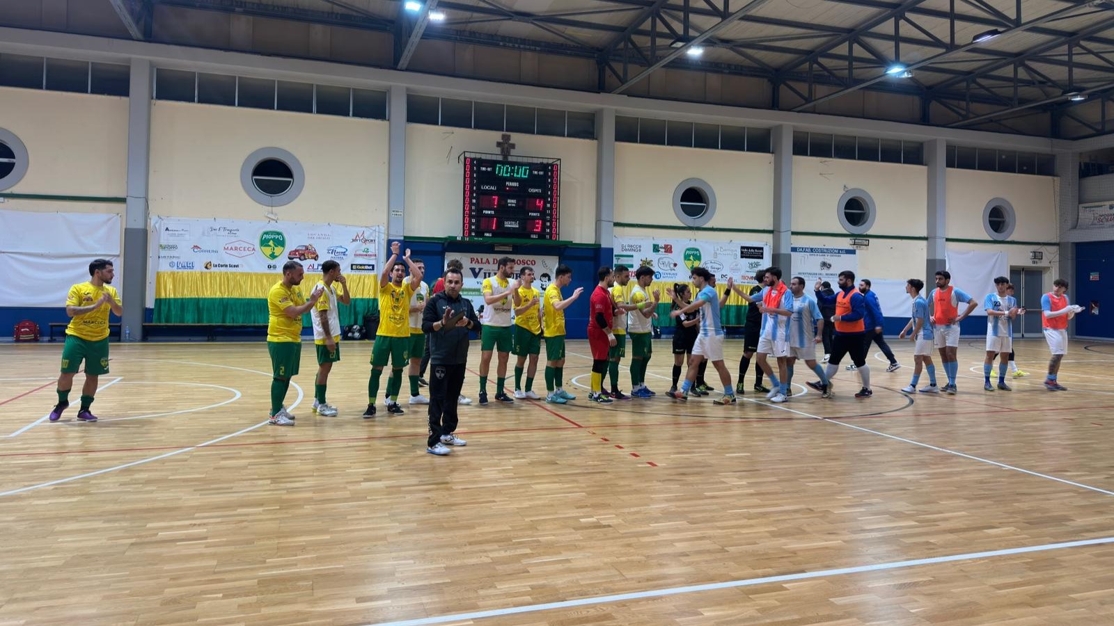 Match che parte subito a razzo con gli ospiti che si portano avanti grazie alla rete di Catanzaro, ma i padroni di casa rispondono subito con Lo Giudice. Il pareggio dura poco e il vantaggio biancoazzurro arriva nuovamente e questa volta con Fragale, bravo a pressare i gialloverdi e complice l’estremo difensore Marineo che sbaglia il rilancio facendo carambolare la sfera sul 18 dell’Oratorio che termina in rete. Passa qualche minuto sul cronometro del Don Bosco e Lo Bianco acciuffa il pareggio per il Pioppo, ma quasi allo scadere del primo tempo ci pensa Cernigliaro a spedire in rete il gol del 3-2. Il secondo tempo si apre con lo stesso canovaccio del primo: i padroni di casa agguantano nuovamente il pareggio con Lo Giudice e gli ospiti si portano ancora avanti con Fragale per il 4-3. Di lì a poco i ragazzi dell’Oratorio San Vincenzo prova l’assedio ma trova Marineo a murare la porta e l’energia spesa pressando su ogni pallone e correndo ovunque per il campo si fa sentire, i gialloverdi ne approfittano ribaltando del tutto il match. Sale in cattedra Calvaruso che nel giro di pochi minuti riesce a firmare una doppietta personale, condita dagli assist di Ferrara e Alongi; il Pioppo non molla e Allegra trova la rete del 6-4 e a pochi minuti dalla sirena Calvaruso cala il tris per il finale 7-4 mandando in estasi il pubblico gialloverde. Al termine del match scambio di saluti tra le due formazioni tra gli applausi dei tantissimi tifosi gialloverdi e biancoazzurri accorsi per seguire una bellissima partita che non ha deluso le aspettative.