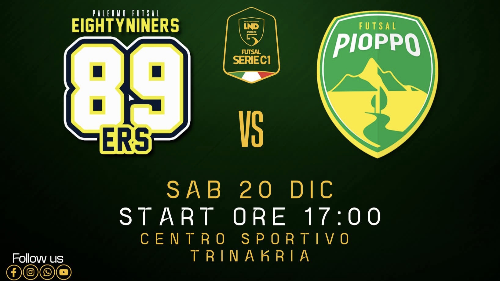 Oggi pomeriggio il Pioppo Futsal scenderà in campo per la 15ª giornata del Campionato di Serie C1, i gialloverdi faranno visita al Palermo Futsal 89ers al centro sportivo Trinakria. I gialloverdi sono reduci dall’ottima vittoria casalinga ai danni dell’Oratorio San Vincenzo, mentre i locali sono imbattuti da quattro partite consecutive. Mister Basile lo sa bene e riguardo la partita che attende i suoi ragazzi tra qualche ora ha dichiarato: “Si tratta di una partita difficile contro un’ottima squadra che sta facendo bene e si è rinforzata nel mercato di dicembre. Proveremo a dare continuità al nostro momento di forma consapevoli che troveremo un avversario agguerrito, preparato, forte ed abituato maggiormente al campo sintetico.” Ambedue le squadre vorranno concludere l’anno in bellezza portando a casa tre punti d’oro: per gli 89ers, in ottava posizione a 19 punti, significherebbe proiettarsi a ridosso della zona play-off; mentre per i gialloverdi, in quinta posizione a 22 punti, l’intera posta significherebbe mantenere salda la zona play-off. Appuntamento oggi, sabato 20 dicembre, presso il Centro Sportivo Trinakria di Palermo con calcio d’inizio previsto per le ore 17:00.