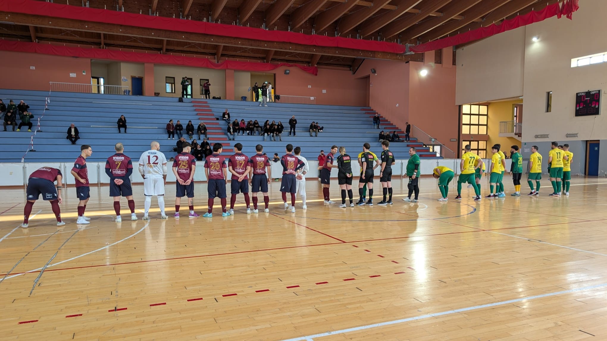 Sabato pomeriggio i gialloverdi del Pioppo Futsal sono tornati in campo per la prima uscita del 2026, in occasione della 16ª giornata del Campionato di Serie C1, portando a casa 3 punti importantissimi contro un avversario mai domo per iniziare bene l’anno. Il match parte subito a razzo con le due squadre che creano tanto ma trovano gli estremi difensori, Alessi da una parte e Federico dall’altra, sempre pronti a disinnescare le palle gol. I gialloverdi sono più pericolosi dei locali e Lo Bianco spedisce in rete una palla vagante in area dopo il palo colpito da Calvaruso. Passa poco e arriva il doppio vantaggio con Allegra, bravo a rubare una palla nella propria metà campo e a spedire in rete un missile terra-aria dopo uno scatto palla al piede inseguito dai locali. La Vigor alza i ritmi e accorcia le distanze con Macaluso; nel finale il Pioppo Futsal insiste e crea diverse occasioni, Quinario ruba la sfera a centrocampo e sorprende Alessi con un tiro potente che l’estremo difensore non può trattenere, mandando così la sua squadra a riposo nuovamente sul +2. La seconda frazione si apre con i locali più propositivi e nel giro di poco agguantano il pareggio con la doppietta di Alessi A. Il Pioppo ricomincia a studiare gli avversari e torna in vantaggio sugli sviluppi di una punizione con La Piana, che servito da Prestigiacomo piazza la sfera nell’angolo basso dove Alessi non può arrivare. La Vigor continua a creare azioni nella metà campo del Pioppo e grazie ad una deviazione ospite trova il 4-4. Di lì a poco sale in cattedra il trio Alongi-Calvaruso-La Piana: il 27 recupera una palla pericolosa, serve di suola il Alongi che serve Calvaruso che davanti alla rete spedisce in gol nonostante due avversari a coprire la linea di porta per il momentaneo 5-4. Da un’altra punizione arriva la zampata di Calvaruso che vale la doppietta personale e il 6-4 gialloverde, con i locali che di lì a poco iniziano il forcing finale con il quinto uomo di movimento. Nel finale i gialloverdi guadagnano il tiro libero che Alongi trasforma per il finale 7-4.