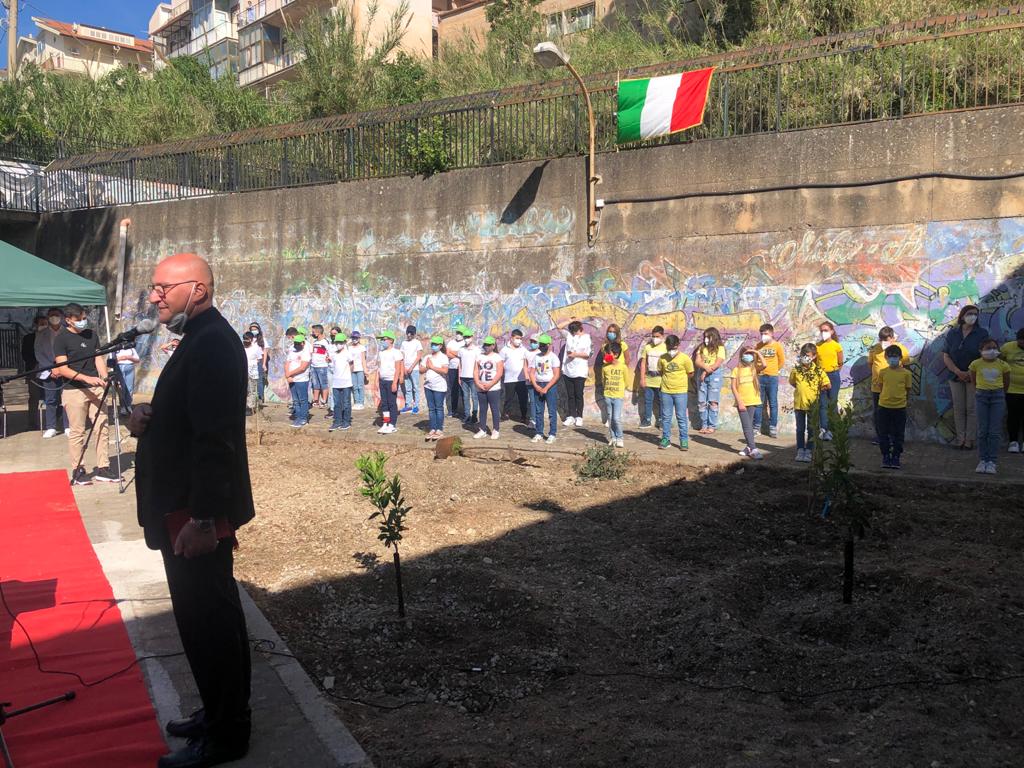 I bambini dell’infanzia, insieme agli alunni delle classi quinte di scuola primaria e ai ragazzi delle classi prime di scuola secondaria di primo grado, hanno accolto il sindaco intonando l’Inno Nazionale. Dopo il saluto della Dirigente, professoressa Francesca Giammona, Padre Nicola Gaglio ha ricordato la figura del giudice Livatino la cui beatificazione è cronaca di questi giorni. Padre Gaglio ha quindi benedetto, prima di essere piantumato, il Carrubo con il quale la scuola intende onorare la figura di Francesca Morvillo, coniugando quest’albero al suo significato allegorico per la nostra cittadina ma anche al suo senso biblico dove il carrubo, insieme all’ulivo e al cedro, simboleggiano “il giusto”.