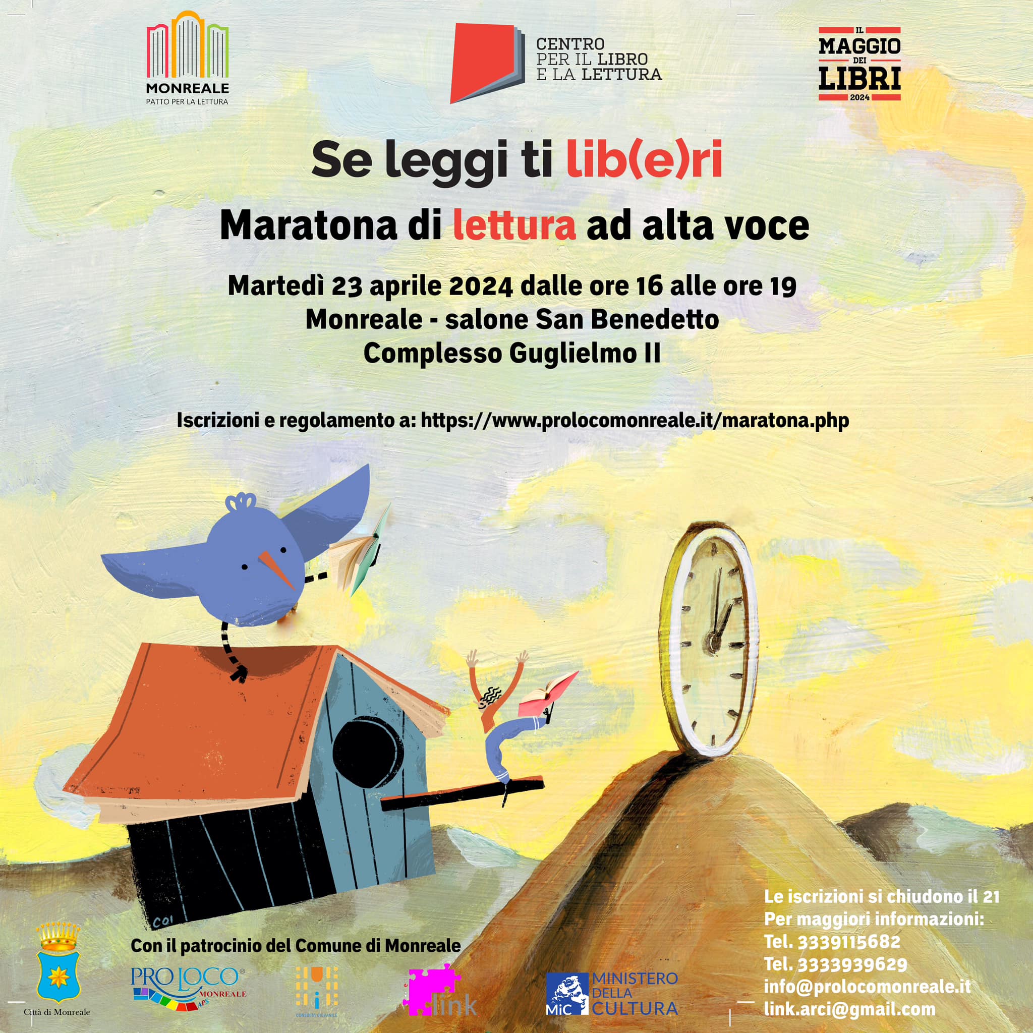 L’Associazione Link Collettivo Arci, la Consulta Giovanile e la Pro Loco Monreale organizzano, all’interno del Patto per la Lettura, una “Maratona di letture ad alta voce” in occasione della Giornata mondiale del libro. Si tratta di un’occasione per condividere le letture che stanno più a cuore ad ognuno di noi e nel contempo ascoltare quanto ognuno ha da trasmettere sotto il comun denominatore dell’amore per la lettura. L’evento si terrà il 23 aprile dalle ore 16:00 alle ore 19:00 presso la sala San Benedetto del Complesso Monumentale Guglielmo II.