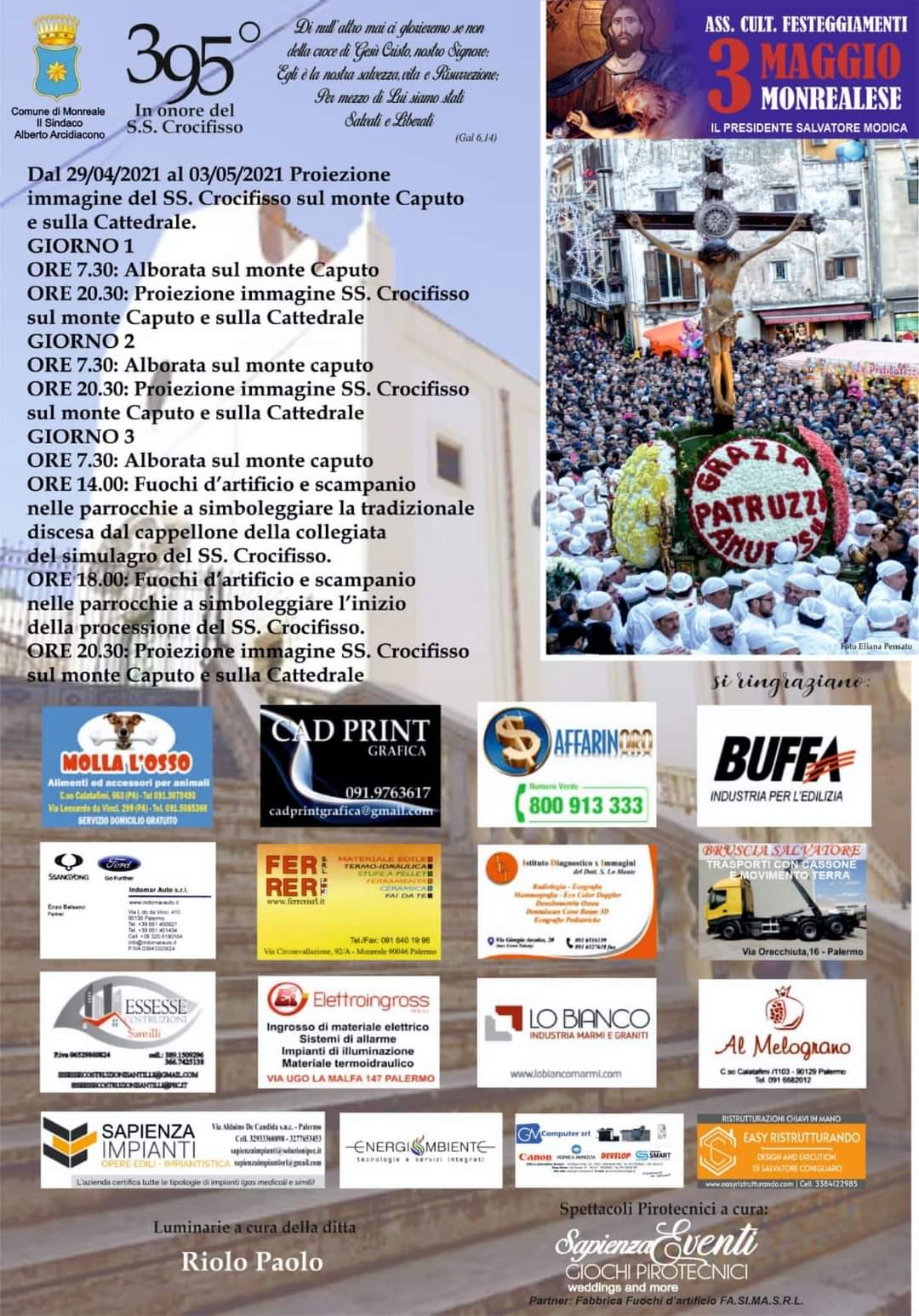 Niente processione a Monreale ma solo eventi religiosi all’interno del Santuario e nel rispetto delle norme anti Covid. L’associazione monrealese “Festeggiamenti 3 maggio” intanto ha stilato il programma relativo ai giorni di festa in collaborazione con l’amministrazione comunale.