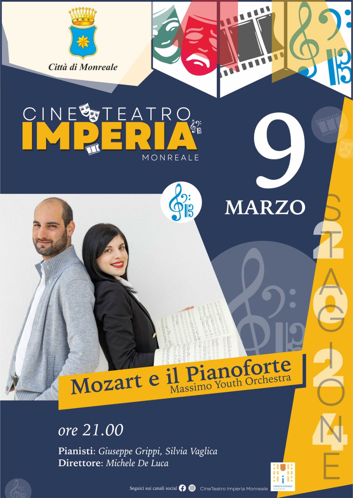 MONREALE – Il Teatro Imperia di Monreale prosegue con successo la programmazione con la Stagione Musicale curata da Giovan Battista Vaglica. Sette gli appuntamenti in cartellone da marzo a maggio, scelti all’insegna della varietà di genere, contenuti e interpretazioni. Sabato 9 marzo alle ore 21.00 l’inaugurazione è affidata al concerto “Mozart e il Pianoforte”, che vede come solisti al pianoforte Silvia Vaglica e Giuseppe Grippi accompagnati dalla Massimo Youth Orchestra diretta dal Maestro Michele De Luca.
