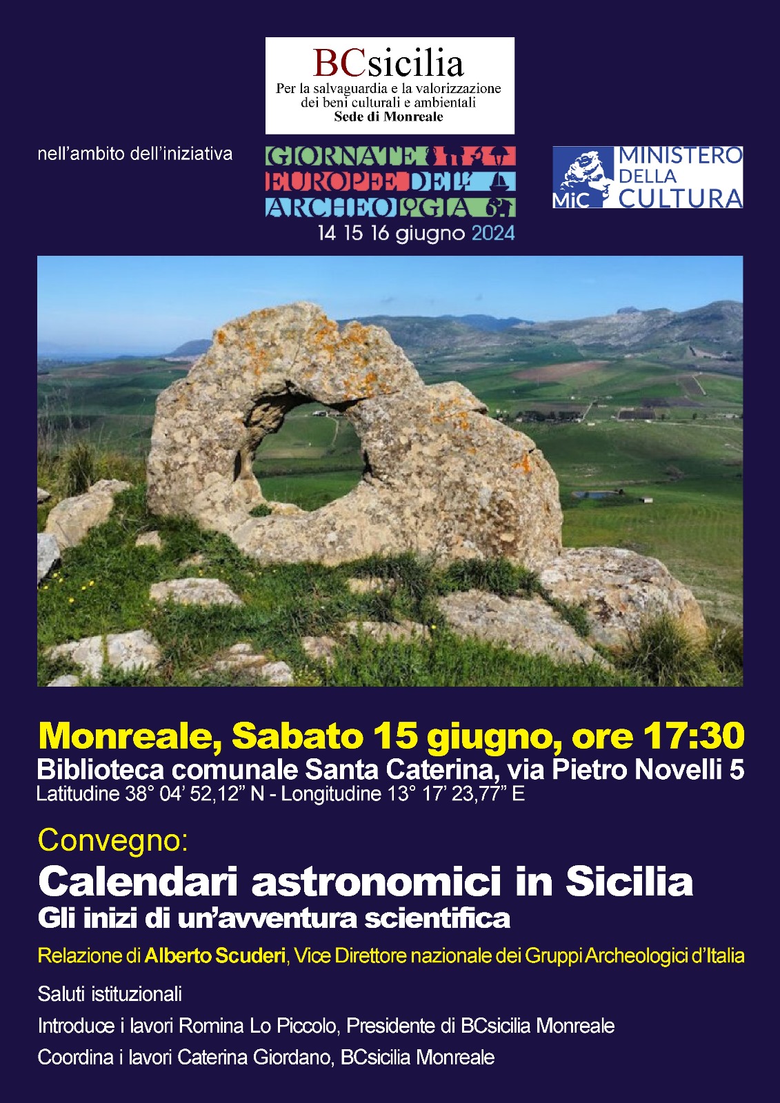 La proposta è articolata in due momenti distinti, quello seminariale e quello esperienziale. Sabato 16, alla biblioteca Santa Caterina, alle 17 30, si terrà il convegno ” Calendari astronomici in Sicilia. Gli inizi di un’avventura scientifica”, condotto da Alberto Scuderi, vicedirettore nazionale dei Gruppi Archeologici d’Italia.