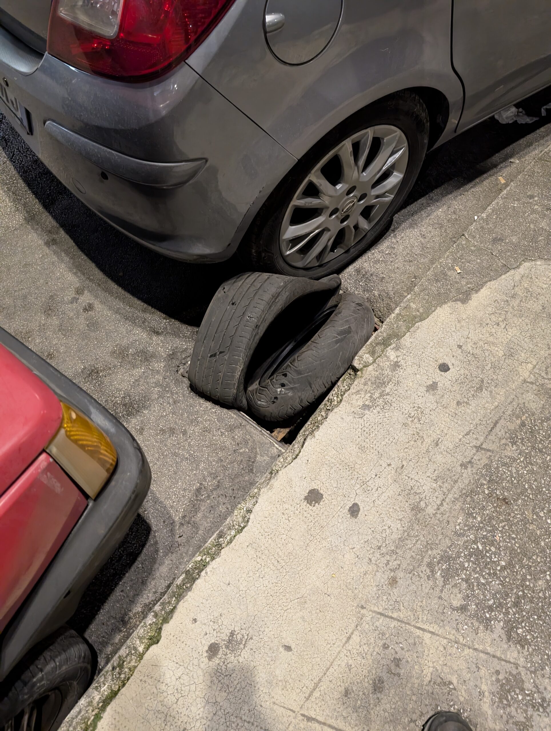 A Monreale tombini pericolosi, uno segnalato da due pneumatici