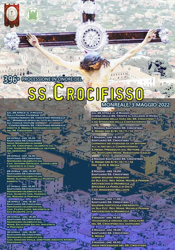 MONREALE – Via alla festa del SS Crocifisso di Monreale. La Confraternita ha già pubblicato il programma delle manifestazioni religiose che culmineranno con la grande e commovente processione in spalla del simulacro del SS Crocifisso il 3 maggio, dalla 18 fino a notte fonda.