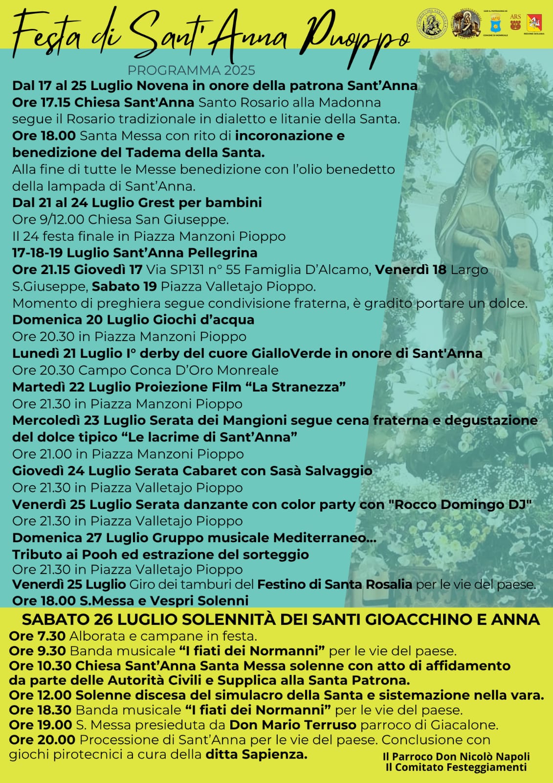 Ieri a Pioppo ha avuto inizio la novena in onore di Santa, Patrona della comunità pioppese, con il rito dell’incoronazione della Madonna e l’imposizione del Taddema a Sant’Anna. Alla celebrazione hanno partecipato tante persone e per Don Nicolò Napoli sarà la prima festa in onore di Sant’Anna. Il sacerdote, arrivato a Pioppo a settembre, ha commentato così l’imminente arrivo della tanta attesa festa patronale: “Sono molto contento dell’organizzazione e della partecipazione, vedo l’entusiasmo tra la gente e la voglia di trascorrere insieme momenti di celebrazione e di festa. Sarà la mia prima festa in onore di Sant’Anna e tengo a ringraziare tutte le persone che stanno dando il loro contributo per rendere tutto perfetto.” Di seguito tutti gli appuntamenti previsti durante i giorni di festa: