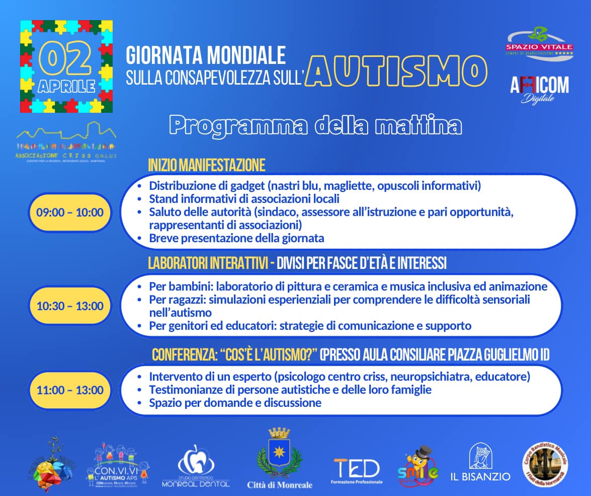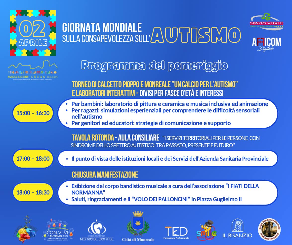 Davide Ciolino, CEO & founder di C.R.I.S.S ETS (Centro per la Ricerca Intervento Socio Sanitario), ha dichiarato: “Il prossimo 2 aprile, in occasione della Giornata Mondiale della Consapevolezza sull’Autismo, l’Associazione CRISS ETS organizzerà una grande manifestazione nel cuore di Monreale per sensibilizzare la cittadinanza sull’importanza dell’inclusione e della comprensione delle persone nello spettro autistico. Come Presidente dell’Associazione CRISS ETS, sono entusiasta di annunciare questa iniziativa, che vedrà il coinvolgimento di istituzioni, scuole, associazioni e cittadini in un evento ricco di momenti di riflessione, attività educative e performance artistiche. Il nostro obiettivo è promuovere una cultura dell’accoglienza, abbattere le barriere del pregiudizio e dare voce a chi troppo spesso non viene ascoltato. La manifestazione si aprirà al mattino e si prolungherà fino al pomeriggio per un dibattito tra le istituzioni locali alle 16:30 presso l’aula consiliare, durante la giornata ci saranno interventi di esperti, testimonianze di famiglie e laboratori dedicati ai più piccoli. In serata, uno dei monumenti più rappresentativi della città verrà illuminato di blu, il colore simbolo della consapevolezza sull’autismo, per ricordare a tutti l’importanza di un mondo più inclusivo. Invito tutta la comunità a partecipare e a unirsi a noi in questa giornata speciale. Solo attraverso la conoscenza e la sensibilizzazione possiamo costruire una società che valorizzi le differenze e garantisca pari opportunità per tutti. Vi aspettiamo il 2 aprile per accendere insieme la luce della consapevolezza!“