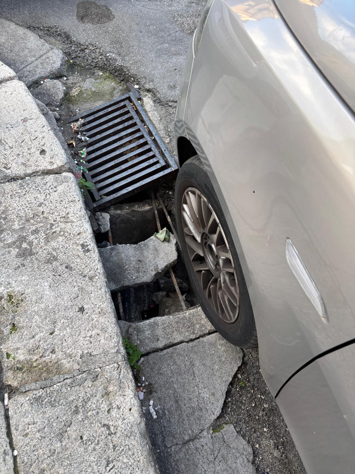 Stessa situazione in via Salita Garibaldi. Qui un tombino è completamente aperto. Per evitare di caderci dentro qualcuno ha messo due pneumatici in attesa di un intervento risolutivo.