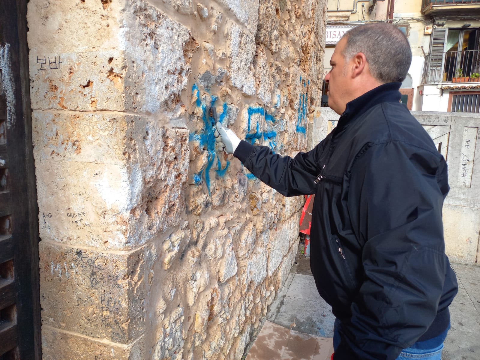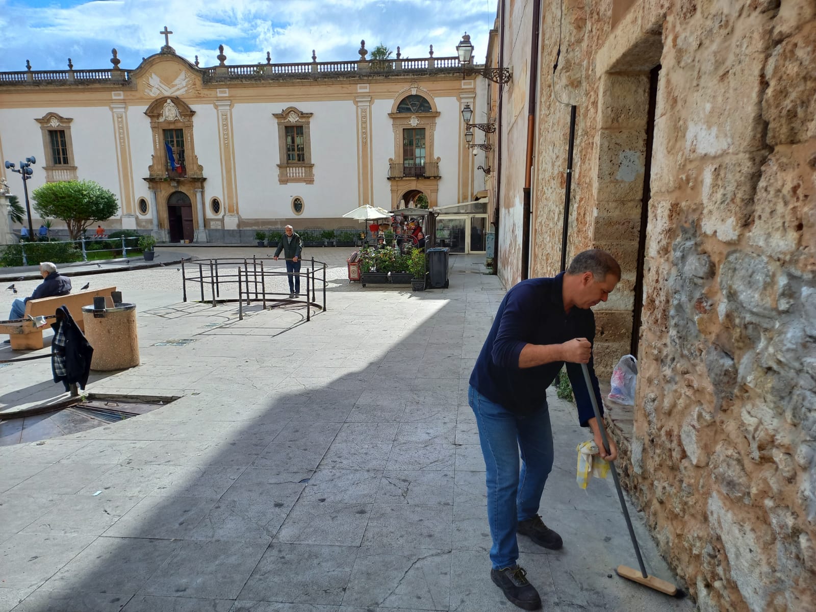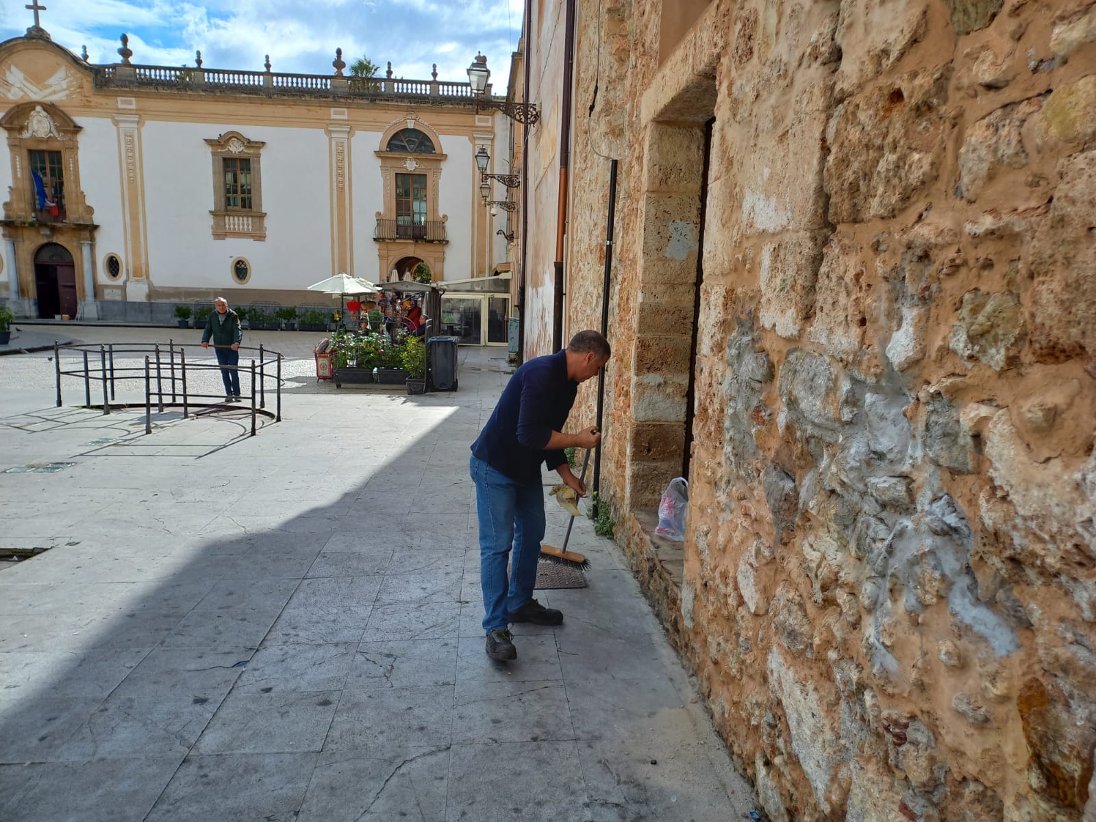 Piero Faraci, del gruppo Basta Crederci, insieme al caposquadra Giovanni Terranova del gruppo di volontari di Palermo, con le direttive dell’amministrazione Alberto Arcidiacono e con Ninni Di Salvo , hanno iniziato a dare dignità a quell’angolo della piazza Guglielmo in cui alcuni ragazzi con delle bombolette hanno lasciato con un brutto biglietto da visita ai tanti turisti che ogni giorno vengono a visitare la nostra Monreale.