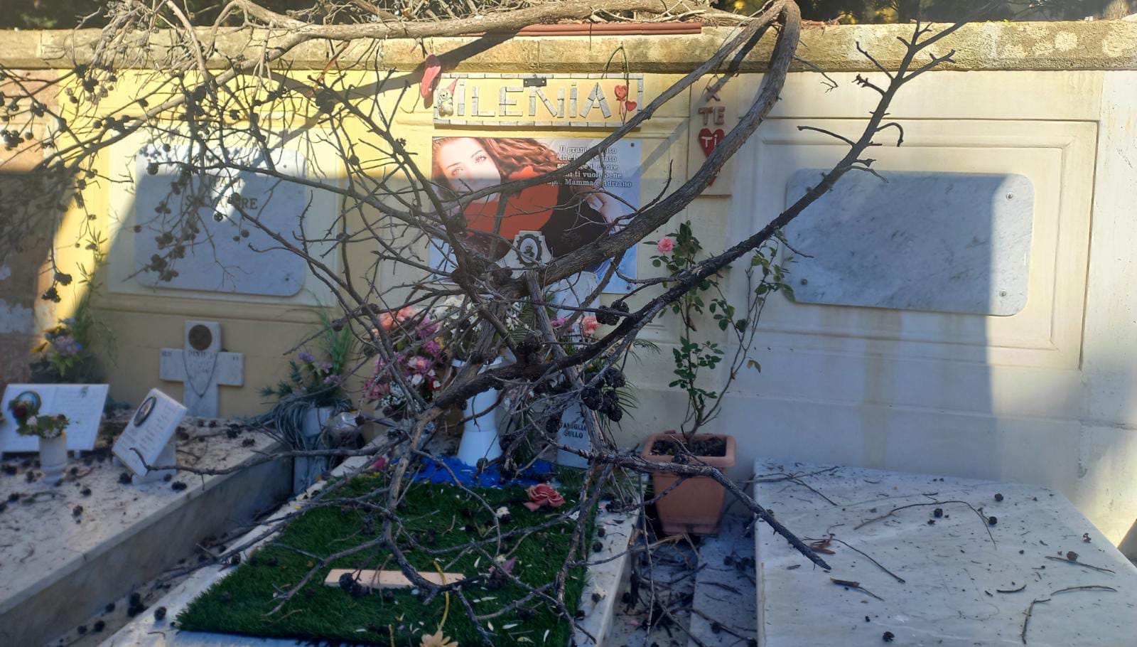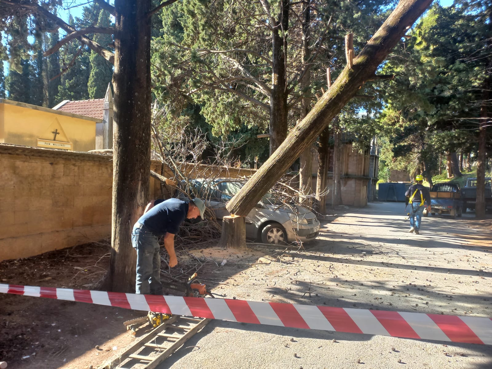 L’intervento è stato necessario poiché questa notte alcuni rami dell’albero, che costeggia il muro di cinta del camposanto, sono caduti giù colpendo anche alcune tombe e un’automobile. L’albero, inoltre, sarebbe stato anche ormai ammalorato creando una situazione di pericolo per passanti e mezzi posteggiati.