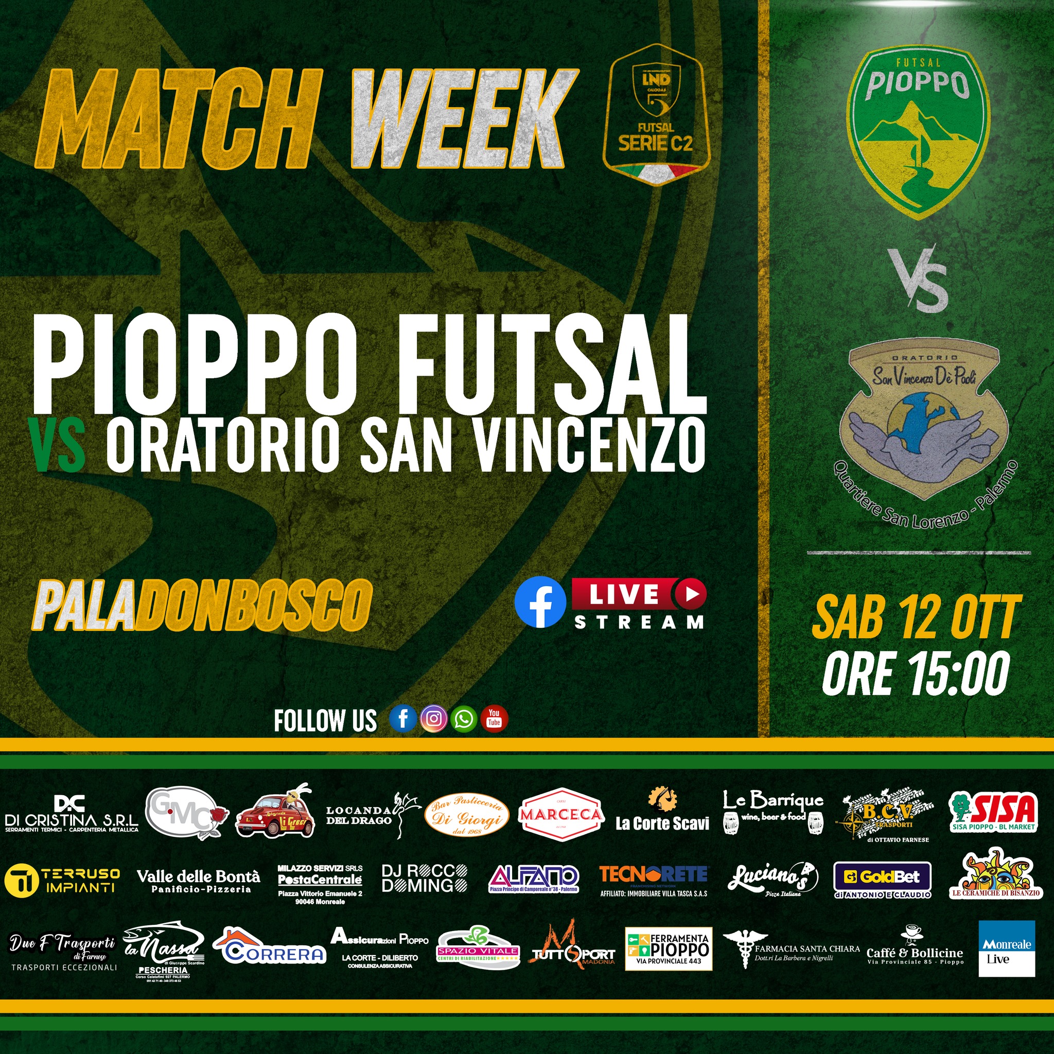 Sabato pomeriggio il Pioppo Futsal tornerà tra le mura del Pala Don Bosco in occasione della terza giornata di campionato, in occasione della quale riceveranno la società palermitana dell’Oratorio San Vincenzo. Reduci dalla sconfitta di Bisacquino i gialloverdi dovranno ritrovare i 3 punti per scacciare via la brutta prestazione di sabato scorso; dall’altra parte i biancoazzurri dell’Oratorio San Vincenzo lo scorso sabato si sono aggiudicati i 3 punti al termine di una vittoria netta per 10-3 ai danni del Favignana e vorranno continuare sulla stessa via.