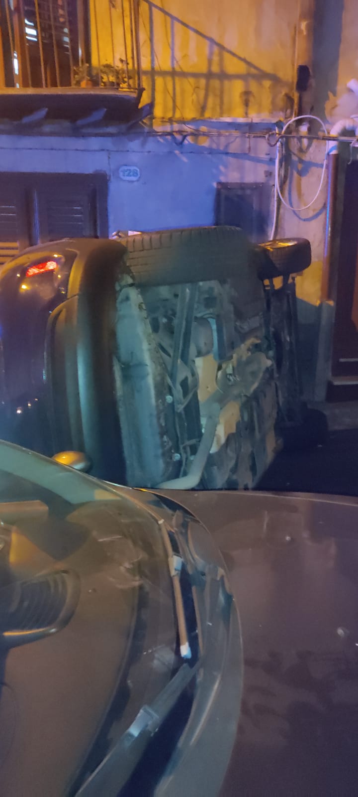 Lo schianto è stato violentissimo. La Fiat 500 ha finito la propria corsa ribaltandosi e incastrandosi tra una palazzina e l’auto con cui si è scontrata.