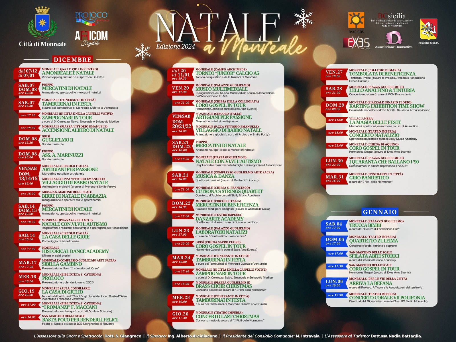 Monreale – Prendono il via domani con l’accensione delle luminarie e i videomapping nel siti culturali di maggiore interesse storico artistico, le manifestazioni organizzate da Comune di Monreale per il Natale 2024. Il fitto calendario che si chiuderà il 6 gennaio prevede un ricco programma di eventi, fra i quali mercatini natalizi con animazione, tamburinai in festa, zampognari in tour, presepi, concerti gospel, presentazione di libri, feste per bambini, Tombolata di beneficienza Sabato 7 alle ore 19.00 è prevista l’accensione dell’Albero di Natale in piazza Vittorio Emanuele. Ed ancora venerdì 27 alle 19.00 al Collegio di Maria.
