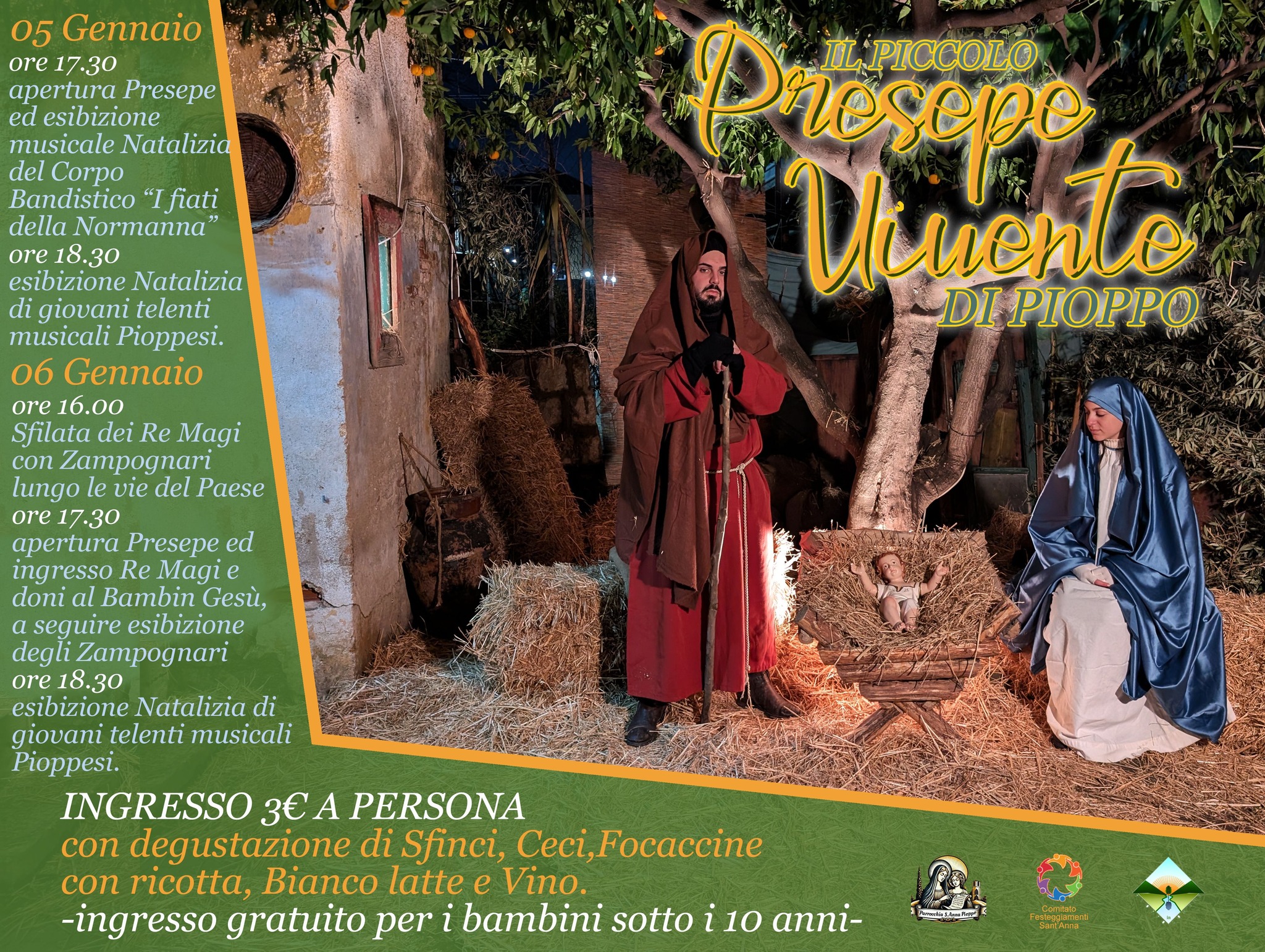 Domenica 5 Gennaio: alle ore 17:30 apertura del Presepe ed esibizione musicale Natalizia del Corpo Bandistico “I fiati della Normanna”, mentre alle 18:30 è prevista l’esibizione Natalizia dei giovani talenti musicali Pioppesi.
