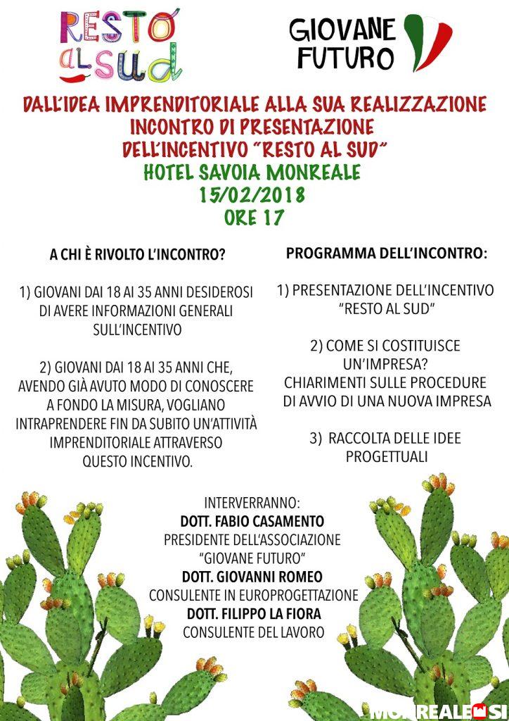 Monreale, 10 febbraio 2018 – Un incontro per meglio chiarire le opportunità offerte dall’incentivo Resto al Sud che permette ai giovani aspiranti imprenditori di poter avviare un’attività grazie ad un incentivo economico che può arrivare fino a 200 mila euro.