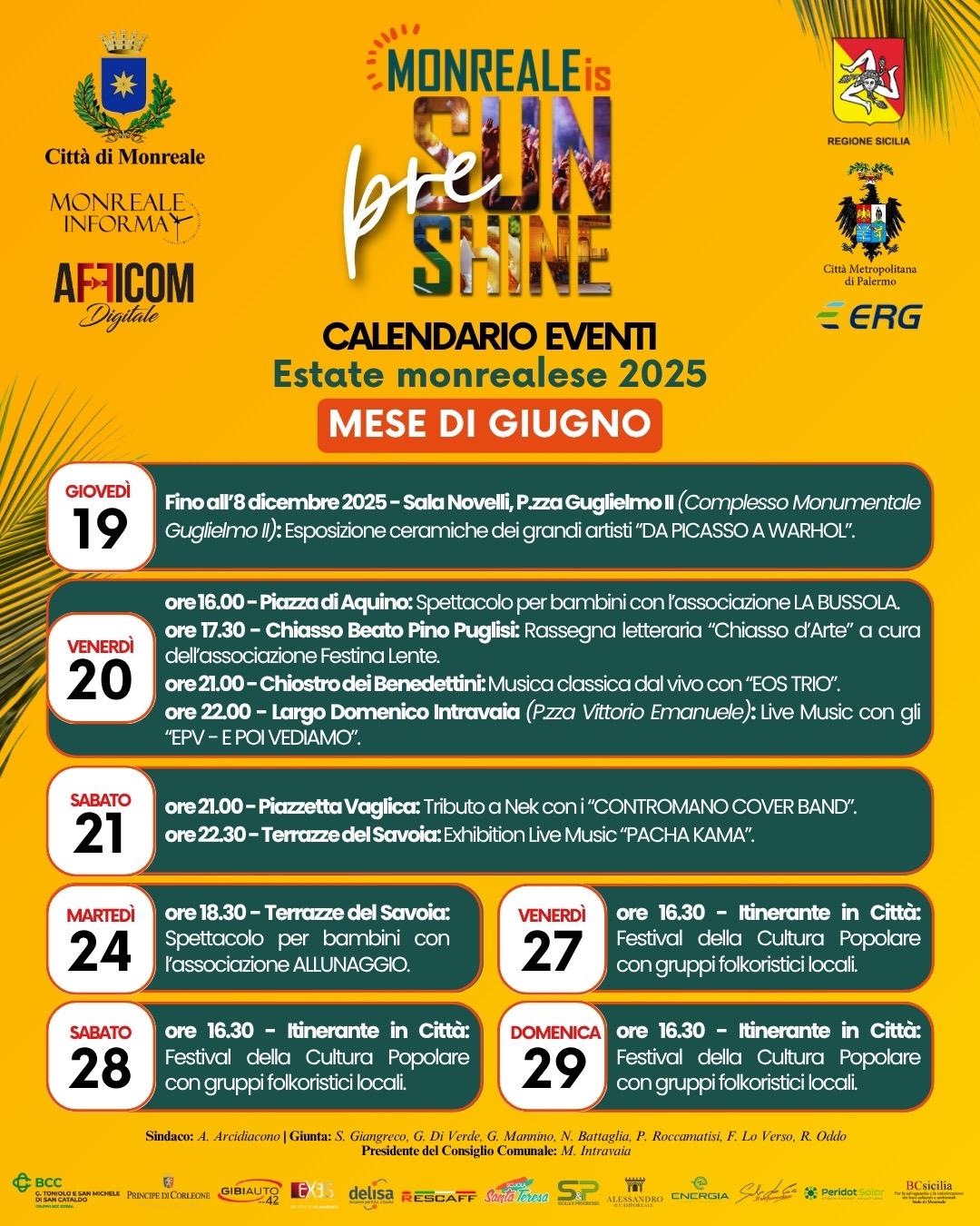 L’Amministrazione Comunale di Monreale è lieta di presentare “Giugno Sotto le Stelle”, il primo assaggio del ricco calendario di eventi estivi racchiuso sotto il nome di “MONREALE IS SUNSHINE 2025”.