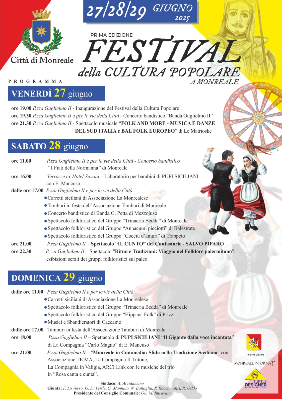 Monreale – Prenderà il via questo fine settimana la prima edizione del Monreale Folk Fest, una tre giorni imperdibile dedicata alle radici culturali siciliane e mediterranee. Dal 27 al 29 giugno 2025, il centro storico di Monreale, con Piazza Guglielmo II come fulcro, si animerà con un ricco calendario di eventi aperti a cittadini e visitatori.