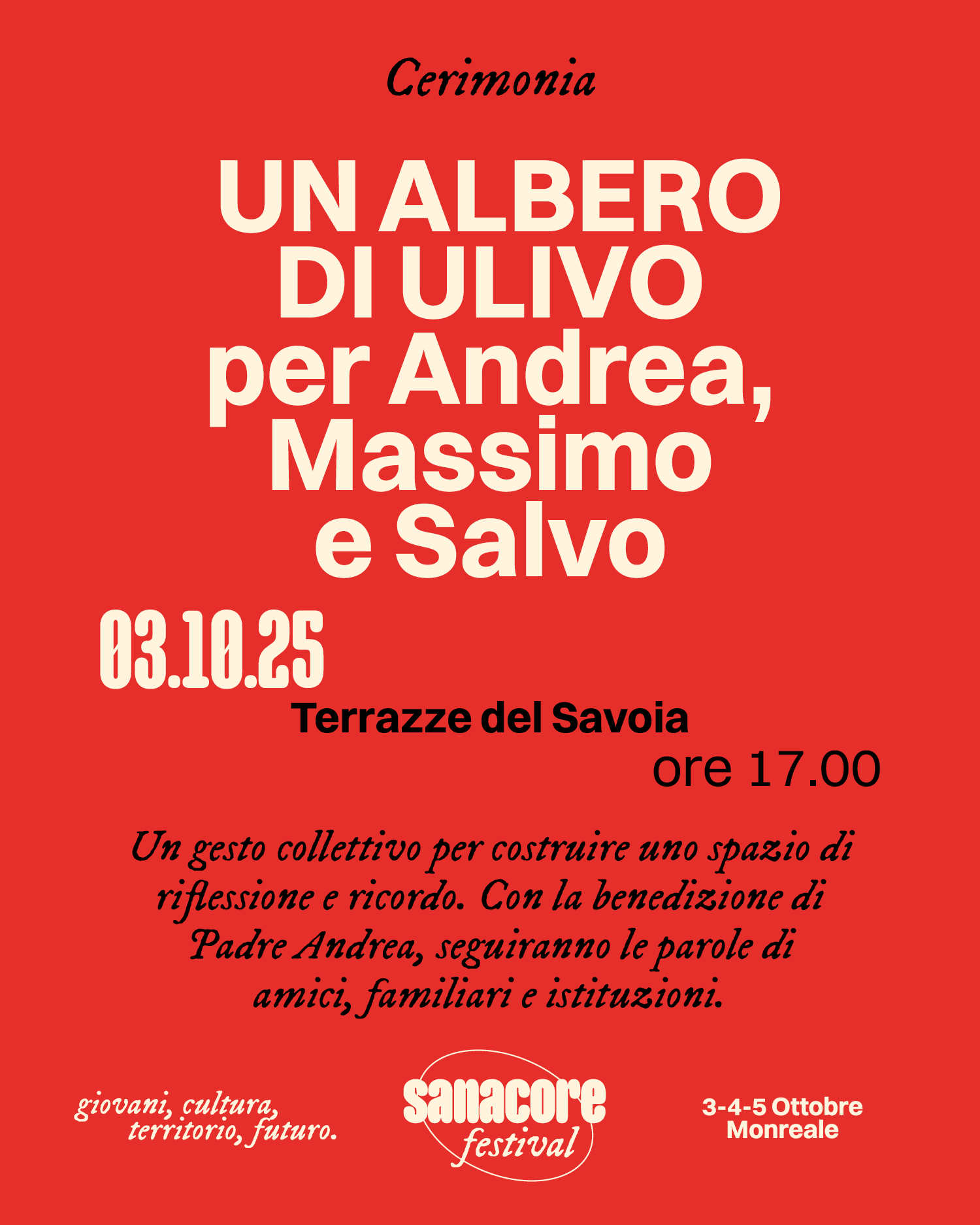 L’evento è stato scelto come apertura del Sanacore Festival, la manifestazione dedicata ai giovani che si svolgerà a Monreale dal 3 al 5 ottobre e che mira a promuovere cultura, musica, socialità e partecipazione attiva. Durante la cerimonia, dopo la benedizione impartita da Padre Andrea, sarà dato spazio alle parole di amici e familiari dei tre giovani, oltre che delle istituzioni locali del territorio. L’invito a partecipare è rivolto a tutta la cittadinanza. L’ulivo, piantato come simbolo eterno di radici e di speranza che si rinnova, resterà nel tempo a ricordare il valore della vita, della comunità e dell’amicizia.