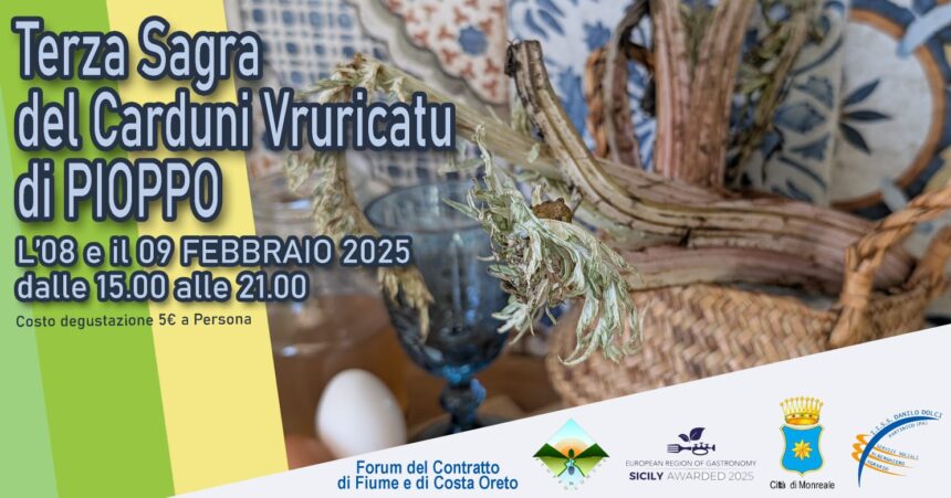Dopo il successo delle scorse edizioni torna la “Sagra del carduni vruricatu” a Pioppo e questa volta le date sono due, l’8 e il 9 febbraio. Il Comitato Pioppo Comune in sinergia con il Comune di Monreale, che ha concesso il patrocinio oneroso, stanno lavorando ormai da settimane per l’ottima riuscita della terza edizione di un’eccellenza pioppese che va tutelata e valorizzata. Durante le due giornate è previsto un intrattenimento folcloristico con il gruppo itinerante “Trinacria Bedda”, inoltre è prevista la partecipazione degli alunni dell’I.I.S.S. Danilo Dolci durante tutta la durata dell’evento.