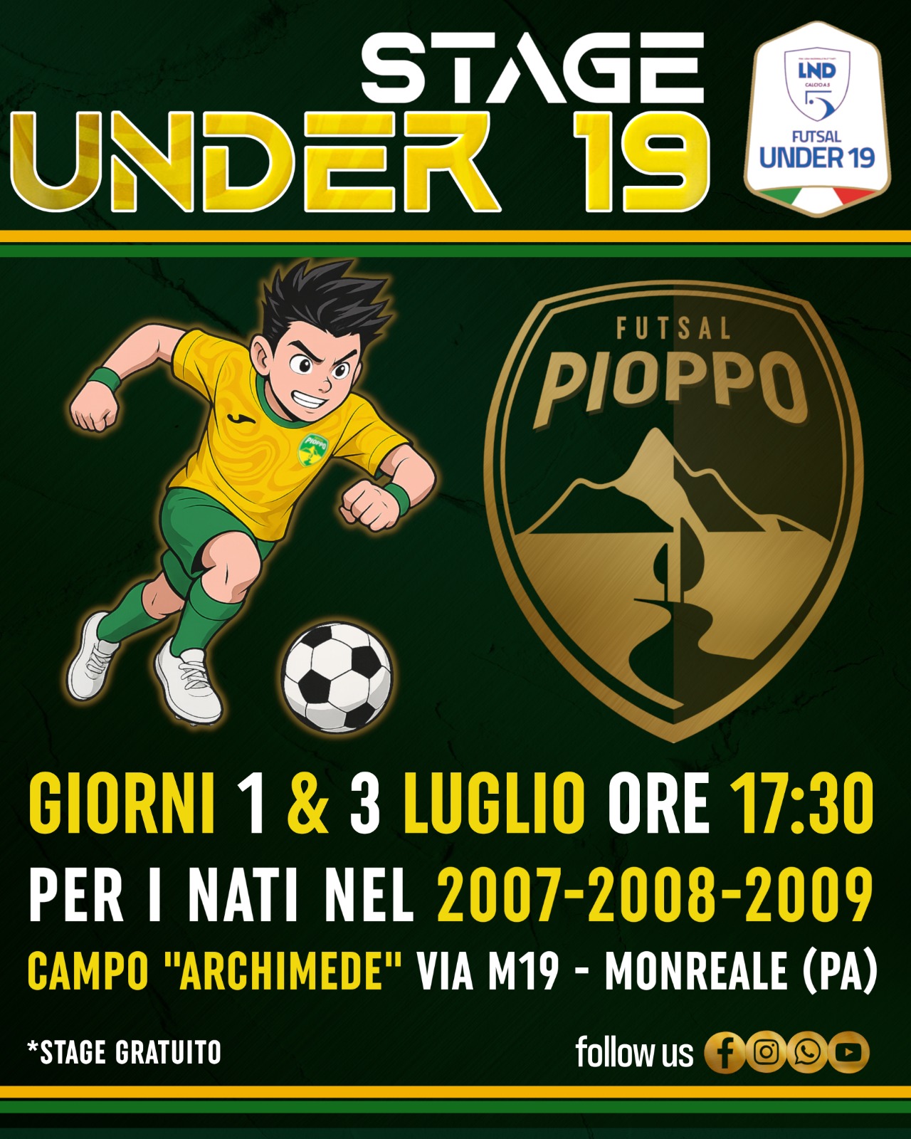 Oggi e giovedì 3 luglio a partire dalle 17:30 si terrà lo stage gratuito dell’Under 19 del Pioppo Futsal presso il Campo Archimede di Monreale. La società gialloverde ha sempre creduto nel progetto Under 19, ponendo già lo scorso anno delle basi solide che gli hanno permesso di raggiungere i play-off. Lo stage sarà svolto con la supervisione dello staff tecnico della prima squadra insieme allo staff tecnico dell’Under 19, che selezionerà i profili più interessanti per formare la rosa Under19 Pioppo Futsal che parteciperà al Campionato Regionale Under19 2025/2026. Sono invitati a partecipare tutti i giovani nati nel 2007, 2008 e 2009. Il momento di ampliare la rosa Under19 è arrivato e si tratta dell’occasione per i nuovi talenti del territorio di unirsi alla grande famiglia gialloverde. Appuntamento oggi 1 luglio e giovedì 3 luglio presso il Campo Archimede di Monreale, sito in Via M.19 – Monreale (PA), con appuntamento alle 17:30 sul rettangolo di gioco.