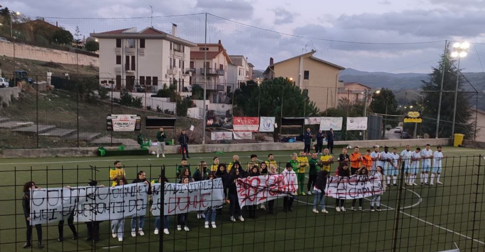Poco prima del calcio d’inizio la “Consulta giovanile di Bisacquino” e il “Circolo delle Donne” sono scesi in campo per dare un calcio alla violenza sulle donne esibendo degli striscioni in occasione della “Giornata Internazionale contro la Violenza sulle Donne” a cui hanno aderito ambedue le società e tifoserie. (foto in fondo all’articolo)