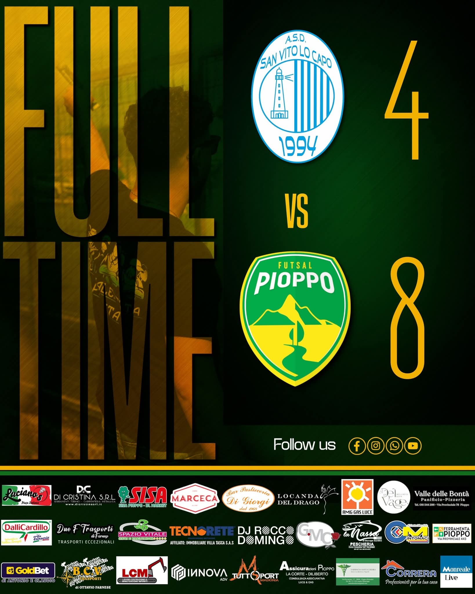 Sabato pomeriggio in quel di San Vito Lo Capo il Pioppo Futsal ha fatto bottino pieno per la prima volta nel Campionato di Serie C1, a pagarne le conseguenze il San Vito Lo Capo 1994. I gialloverdi guidati da mister Basile hanno saputo imporre il proprio gioco e portato a casa 3 punti fondamentali per muovere la classifica. In rete per loro Allegra, Calvaruso, Lo Bianco e Ferrara, quest’ultimo con ben 5 reti. Una partita che da fiducia alla squadra pioppese dopo i 4 pareggi e 1 sconfitta, maturati fino ad ora in campionato. Mercoledì sera alle 19:45 invece arriva il Merlo C5 a far visita ai gialloverdi per il ritorno di Coppa Italia; la gara d’andata si era conclusa con il risultato di 8-5 per gli uomini di mister Basile. Appuntamento a mercoledì sera al Pala Don Bosco di Palermo, con calcio d’inizio previsto per le ore 19:45. Sarà possibile seguire la diretta streaming del match sulla pagina Facebook del Pioppo Futsal.