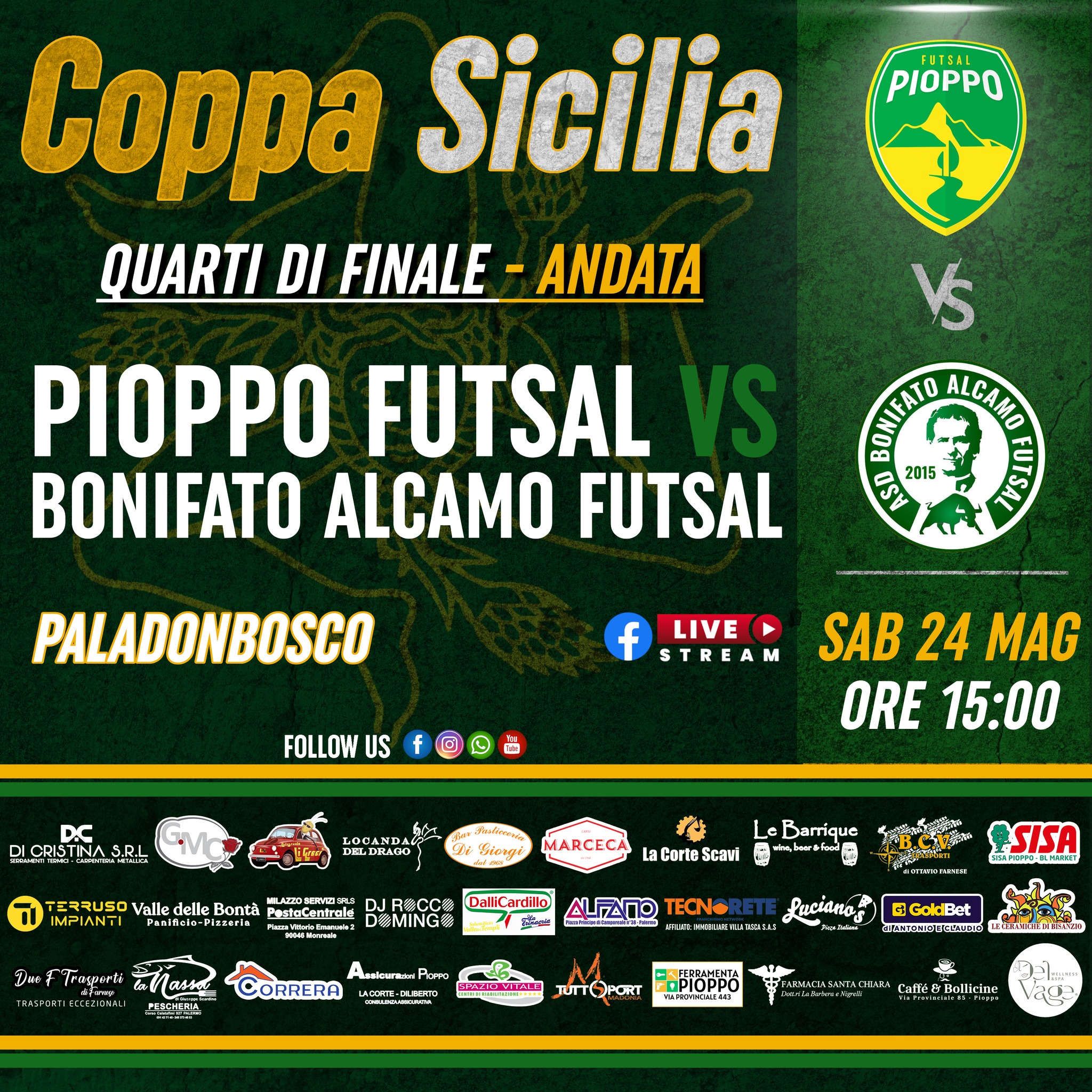 Sabato pomeriggio presso il Pala Don Bosco di Palermo i gialloverdi del Pioppo Futsal scenderanno in campo per l’ultima volta tra le mura amiche del palazzetto palermitano, a far visita ai pioppesi il Bonifato Alcamo Futsal in occasione della gara d’andata dei quarti di finale di Coppa Sicilia. Il caso ha voluto far incontrare nell’abbinamento dei quarti di coppa la prima e l’ultima classificata del Campionato di Serie C2 appena concluso; la doppia sfida di campionato tra gialloverdi e biancoverdi ha visto i primi avere la meglio in entrambe le gare: all’andata i gialloverdi si erano imposti per 3-0 al Pala Grimaudo di Alcamo, mentre al ritorno per 1-0 al Don Bosco al termine di un match in bilico fino all’ultimo minuto di gioco.