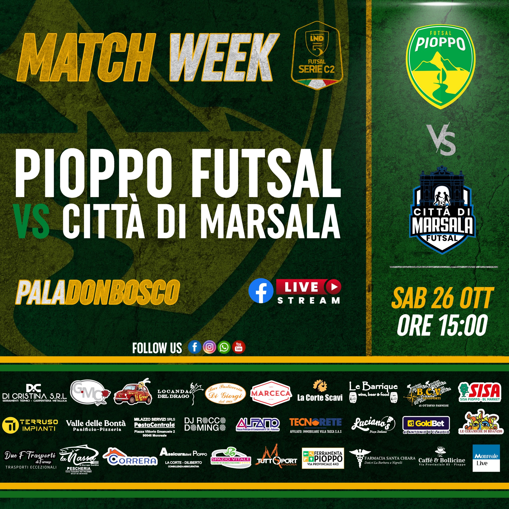 Appuntamento a sabato 25 ottobre al Pala Don Bosco, sito in Via S. Domenico Savio 4 a Palermo, calcio d’inizio previsto per le 15:00; prevista diretta streaming del match sulla pagina Facebook del Pioppo Futsal.