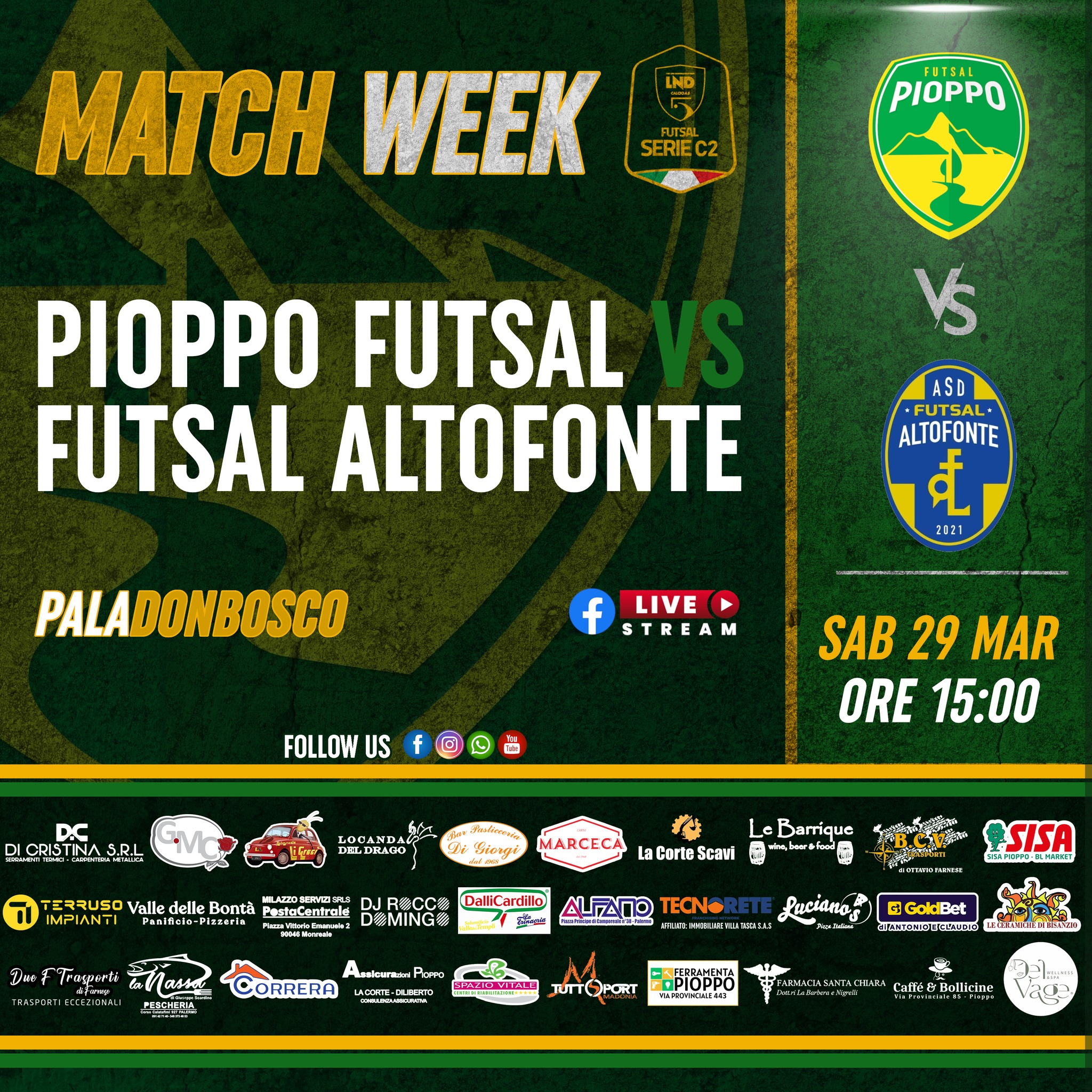 Appuntamento a sabato pomeriggio presso il Pala Don Bosco di Palermo, sito in Via S. Domenico Savio, 4 – Palermo PA, calcio d’inizio previsto per le ore 15:00. Sarà possibile seguire il match in diretta sulla pagina Facebook del Pioppo Futsal.