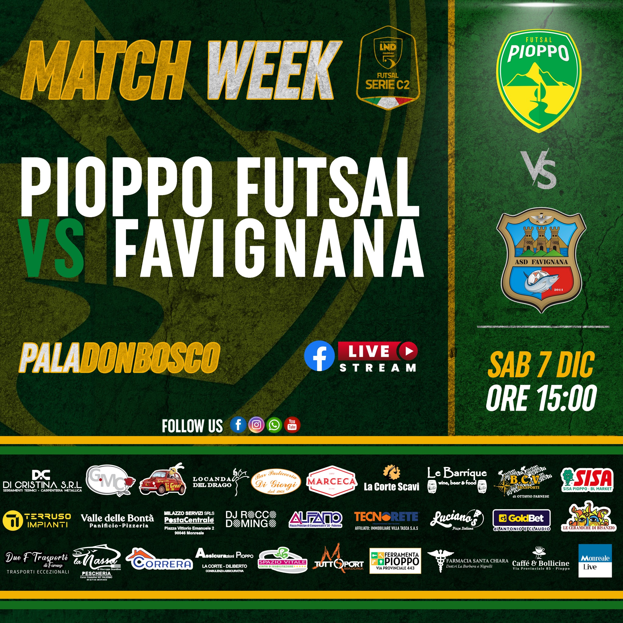 Appuntamento a sabato 7 dicembre presso il Pala Don Bosco, sito in Via S. Domenico Savio 4 a Palermo, calcio d’inizio previsto per le 15:00; sarà possibile seguire la diretta streaming del match sulla pagina Facebook del Pioppo Futsal.