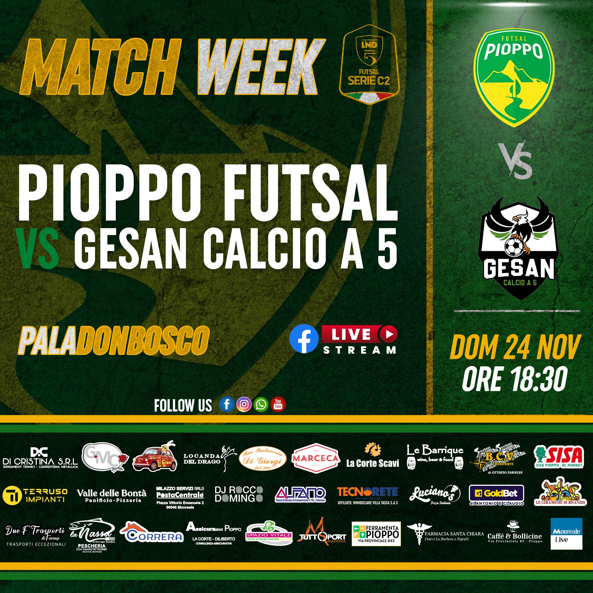 Appuntamento a domenica 24 novembre presso il Pala Don Bosco, sito in Via S. Domenico Savio 4 a Palermo, calcio d’inizio previsto per le 18:30; sarà possibile seguire la diretta streaming del match sulla pagina Facebook del Pioppo Futsal.
