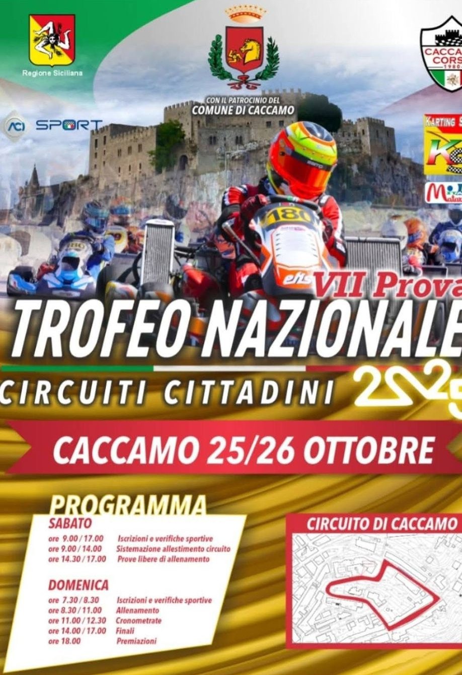 Sabato e domenica all’insegna delle gare su Kart a Caccamo in occasione della 7ª prova Trofeo Nazionale Circuiti Cittadini. Il pioppese Giuseppe Termini pronto a difendere il primato nella Categoria 125 Rookie e tentare la scalata nella Classifica assoluta circuiti cittadini in questa penultima gara della stagione. Il programma prevede quanto segue: sabato dalle ore 9:00 alle ore 17:00 si svolgeranno le iscrizioni e le verifiche sportive; dalle ore 9:00 alle ore 14:00 è prevista la sistemazione e l’allestimento del circuito, mentre dalle ore 14:30 alle ore 17:00 si terranno le prove libere di allenamento. Domenica dalle ore 7:30 alle ore 8:30 saranno aperte le iscrizioni e le verifiche sportive; dalle ore 8:30 alle ore 11:00 si terranno le sessioni di allenamento, seguite dalle prove cronometrate dalle ore 11:00 alle ore 12:30. Nel pomeriggio, dalle ore 14:00 alle ore 17:00, si svolgeranno le finali, mentre la cerimonia di premiazione è prevista per le ore 18:00.