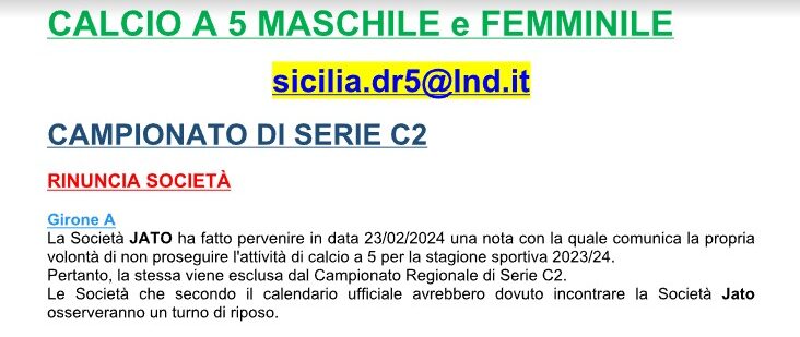 Con la rinuncia al proseguimento del Campionato di Serie C2 23/24 da parte dell’A.S.D. Jato gli scenari e le posizioni in classifica sono cambiate notevolmente per tutte le società interessate. Difatti, i gialloverdi del Pioppo Futsal hanno osservato il turno di riposo sabato, senza disputare la diciassettesima giornata di campionato, poiché annullata a seguito della rinuncia da parte dell’Asd Jato, come da comunicato ufficiale del Comitato Regionale Sicilia LND n.338 del 23 Febbraio 2024: