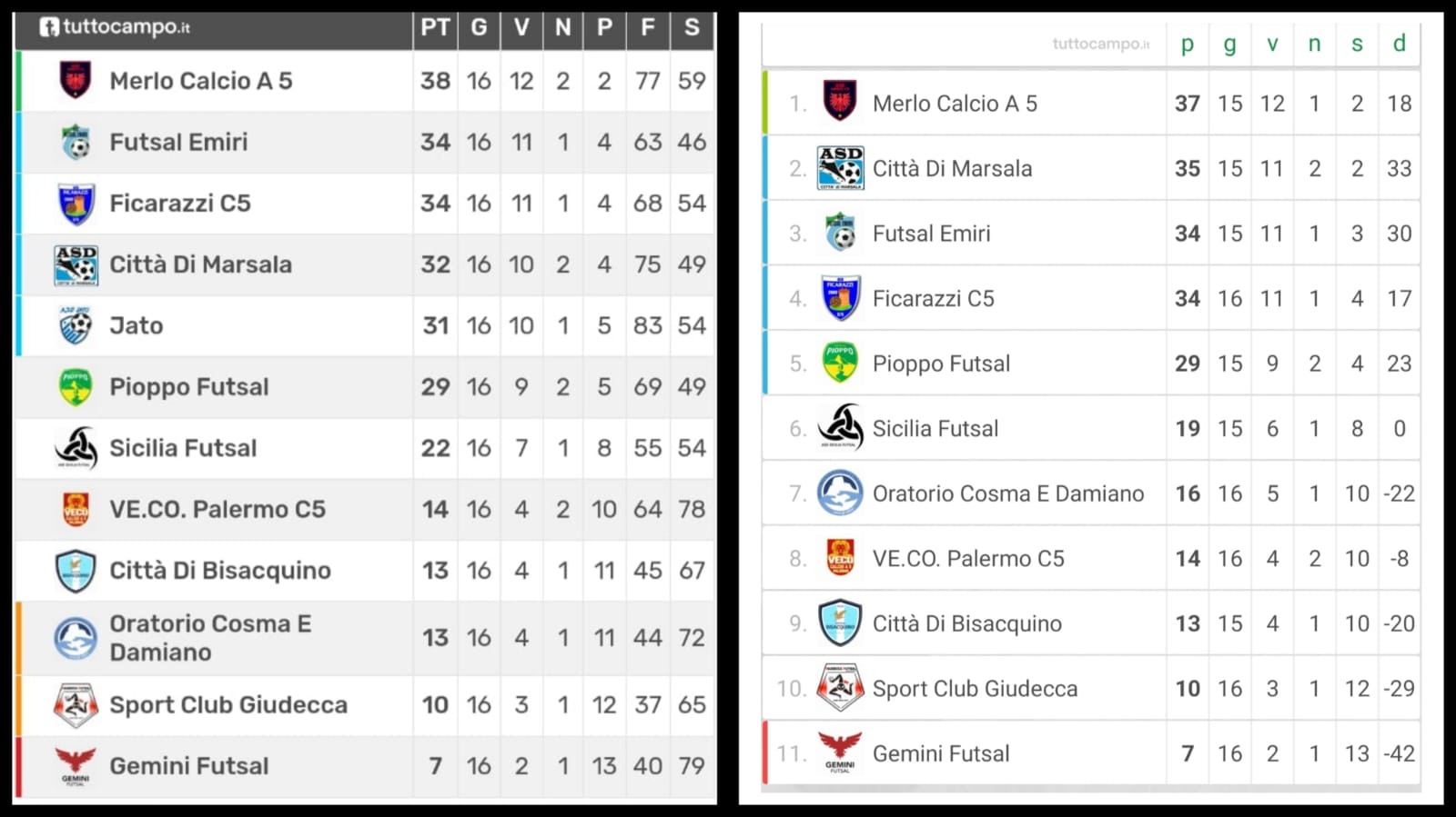 A sinistra la classifica prima della rinuncia al campionato da parte dell’A.S.D. Jato, a destra la classifica aggiornata dopo la diciassettesima giornata. Ad avere la peggio il Merlo Calcio a 5 che si è visto sottrarre 4 punti conquistati contro lo Jato, diminuendo così il distacco dalla seconda in classifica.
