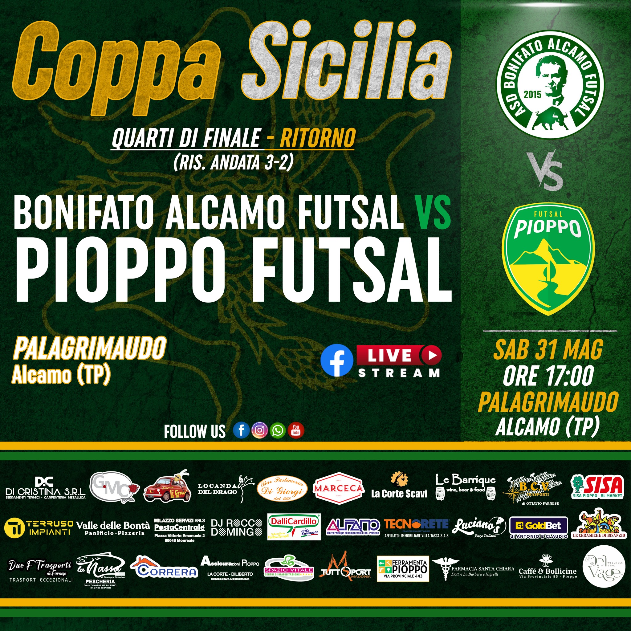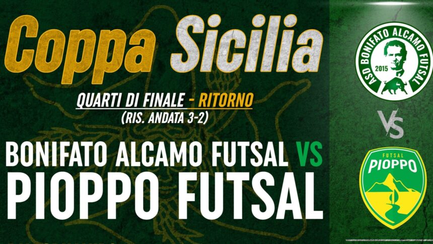 Sabato pomeriggio presso il Pala Grimaudo di Alcamo i gialloverdi del Pioppo Futsal saranno ospiti dei biancoverdi del Bonifato Alcamo Futsal in occasione del match di ritorno dei quarti di finale di Coppa Sicilia. Lo scorso sabato ad avere la meglio sono stati i gialloverdi che si sono imposti per 3-2 al termine di un match spettacolare in un Pala Don Bosco pieno e in festa per la promozione in Serie C1 del Pioppo Futsal. Per i gialloverdi erano andati in gol Prestigiacomo Filippo con due reti e Alongi, mentre per i biancoverdi Imperato su calcio di rigore e Butera. Nel frattempo la società gialloverde ha diramato un comunicato ufficiale per sollevare dall’incarico mister Sciortino.