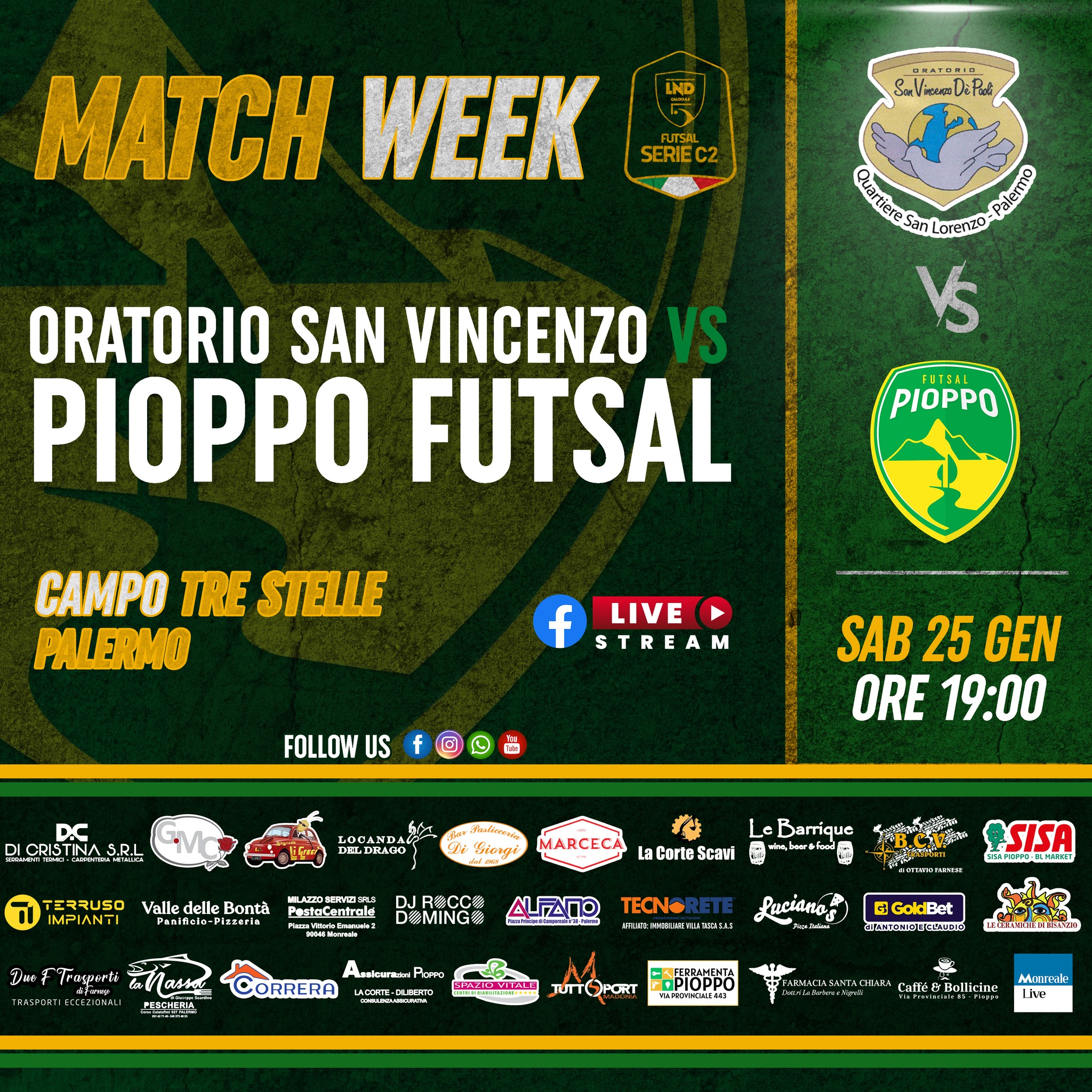 Sabato sera presso il Campo 3 Stelle di Palermo i gialloverdi di mister Sciortino scenderanno in campo in occasione della sedicesima giornata del Campionato di Serie C2, ad attenderli i biancoazzurri dell’Oratorio San Vincenzo.