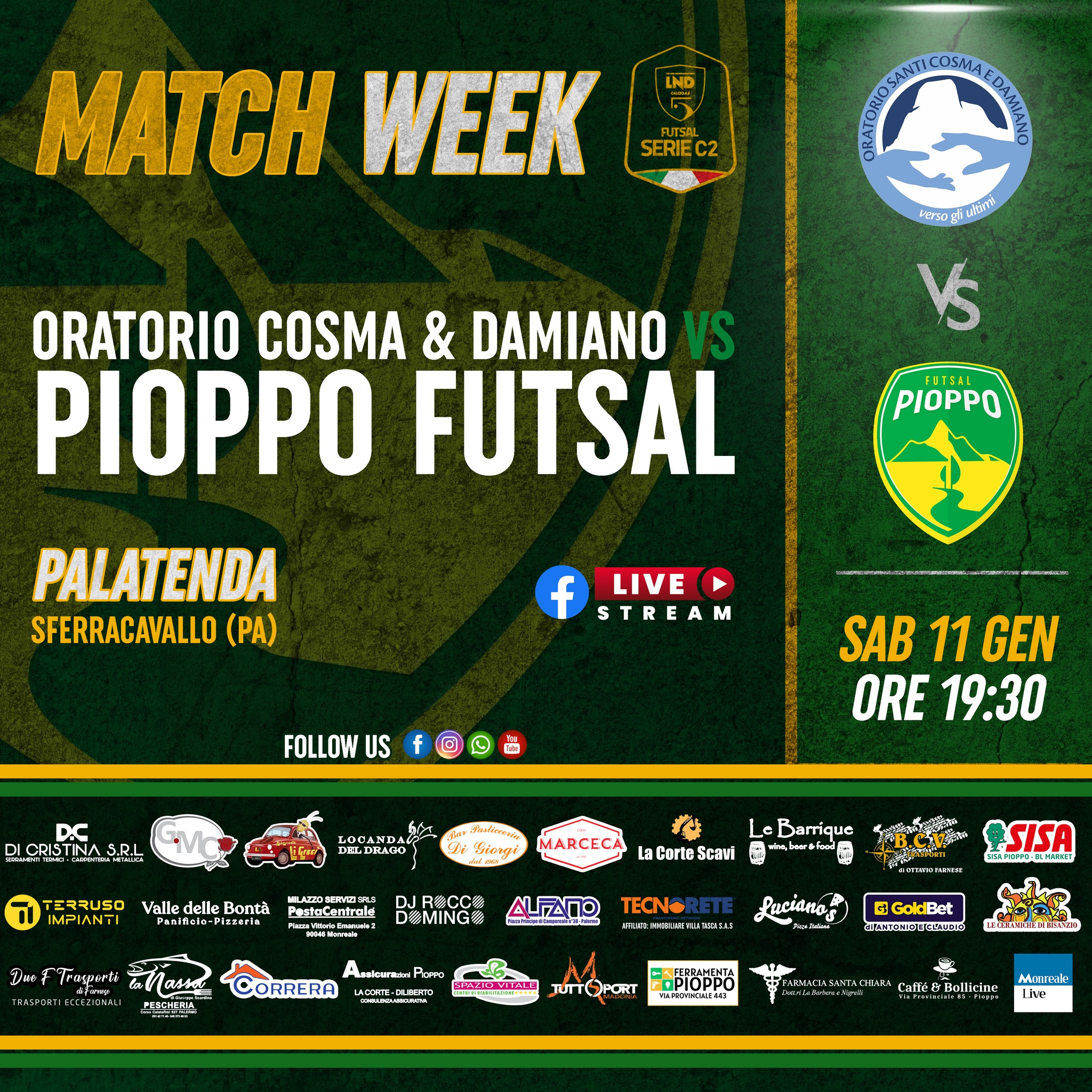I locali nell’ultima giornata prima dello stop natalizio e del turno di Coppa Sicilia avevano raccolto 3 punti importantissimi contro il Club Olimpia al termine di una partita avvincente; per i gialloverdi invece l’anno si era concluso con la vittoria ai danni del Futsal Emiri. La gara d’andata tra le due squadre aveva sorriso ai gialloverdi, che erano riusciti a conquistare i primi punti della stagione imponendosi sull’Oratorio con il risultato di 4-3. Appuntamento a sabato 11 gennaio presso la Palatenda di Sferracavallo, sita in Via Sferracavallo, 117A, Palermo, con calcio d’inizio per le ore 19:30. Diretta streaming del match sulla pagina Facebook del Pioppo Futsal.