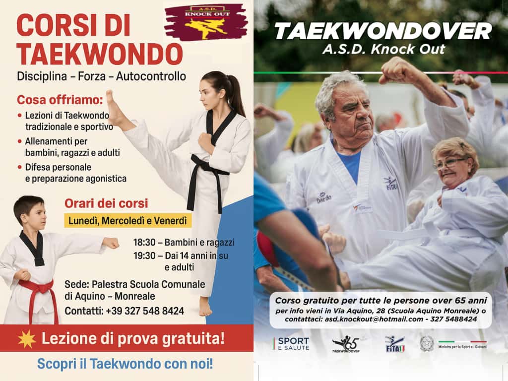 L’Associazione sportiva dilettantistica “Knock Out” del maestro Gianni Caprera è pronta per tornare sul tatami con i tanti giovani intenti ad imparare la disciplina del Taekwondo presso la palestra della scuola di Aquino. Inoltre, il maestro Caprera rinnova l’iniziativa totalmente gratuita promossa lo scorso anno: per tutti gli over 65 sarà possibile praticare Taekwondo presso l’ASD Knock Out. Grazie al finanziamento del Ministero dello Sport e della Salute, tramite la Federazione Italiana Taekwondo, il maestro e il suo team hanno deciso di mettere in pratica un progetto rivolto a tutti gli over 65 residenti a Monreale e che abbiano voglia di imparare il Taekwondo. In questo modo i partecipanti potranno migliorare il benessere fisico e mentale; scoprendo i benefici di una disciplina che promuove l’equilibrio, la coordinazione e la salute generale. Per partecipare è sufficiente avere un certificato medico per attività non agonistica e frequentare le lezioni che si terranno due volte a settimana; luogo e orari delle lezioni saranno resi noti successivamente in base al numero di adesioni. Per aderire all’iniziativa o per maggiori informazioni è possibile contattare telefonicamente il maestro Gianni Caprera al numero 3275488424.